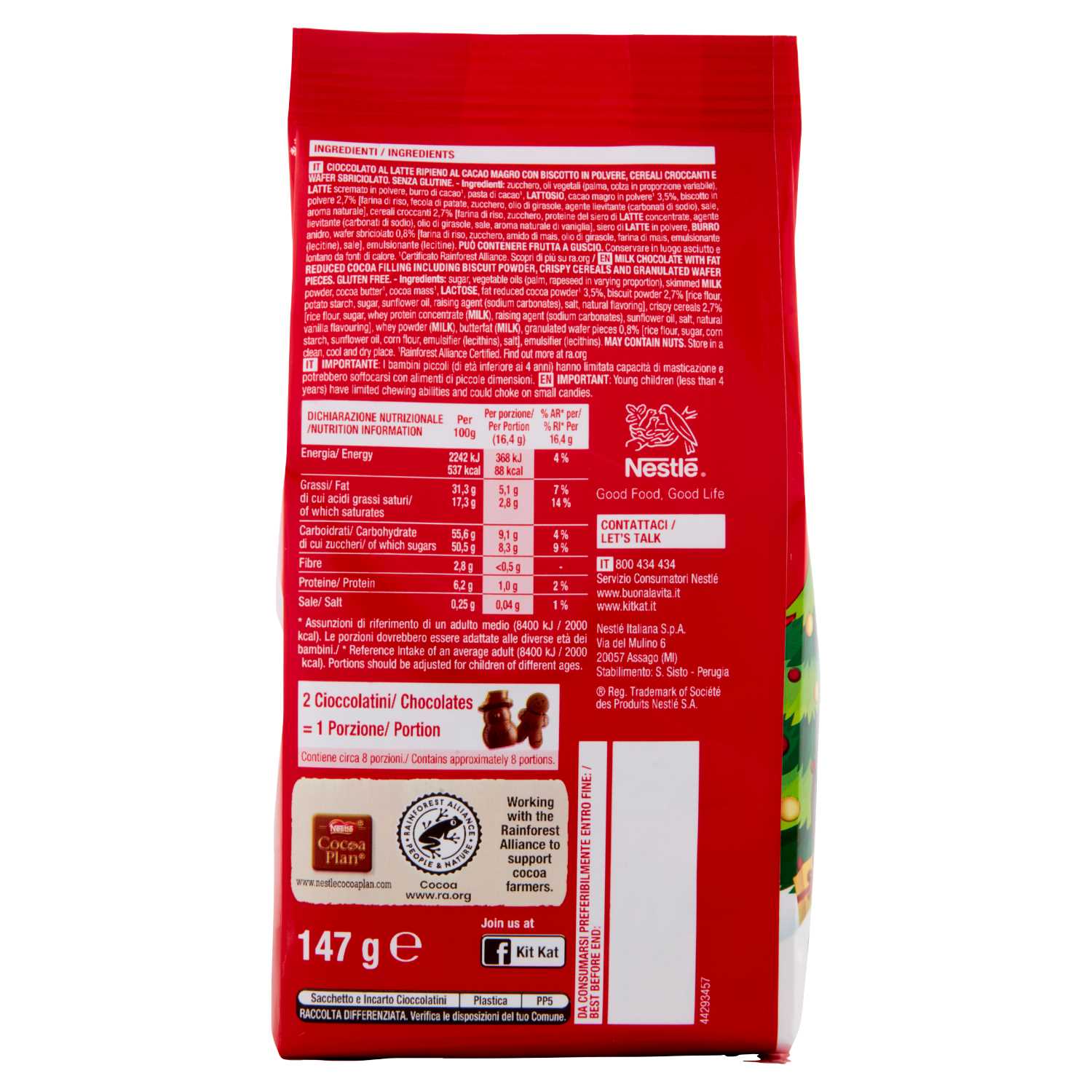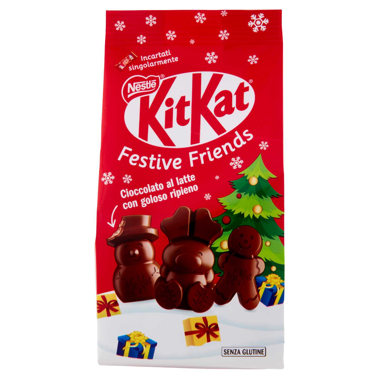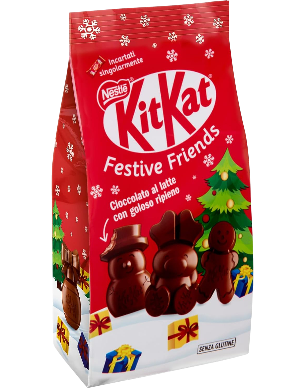 Kitkat Festive Friends è lo snack natalizio firmato NESTLÉ KITKAT! Scopri tutti i KITKAT Festive Friends, golosi snack di cioccolato a latte con goloso ripieno con biscotto in polvere, cereali croccanti e wafer sbriciolato . Tanti mini personaggi dalle diverse forme natalizie incartati singolarmente tutti da scoprire. Senza glutine. Snack di cioccolato a latte kitkat con un morbido ripieno. Tanti mini personaggi tutti da scoprire, per una sorpresa continua, soprattutto a Natale! Il sacchetto festivo da 147g contiene circa 16 KITKAT Festive Friends da 8,2g ciascuno, incartati singolarmente.
