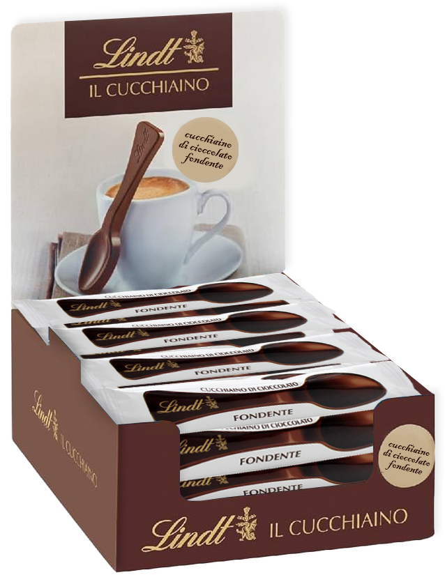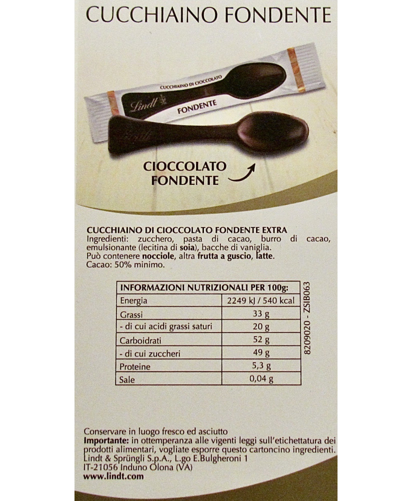Ingredienti: Cucchiaino di cioccolato fondente extra. Ingredienti: zucchero, pasta di cacao, burro di cacao, emulsionante (lecitina di SOIA), bacche di vaniglia. NOCCIOLE, altra FRUTTA A GUSCIO, LATTE.
