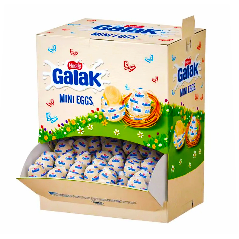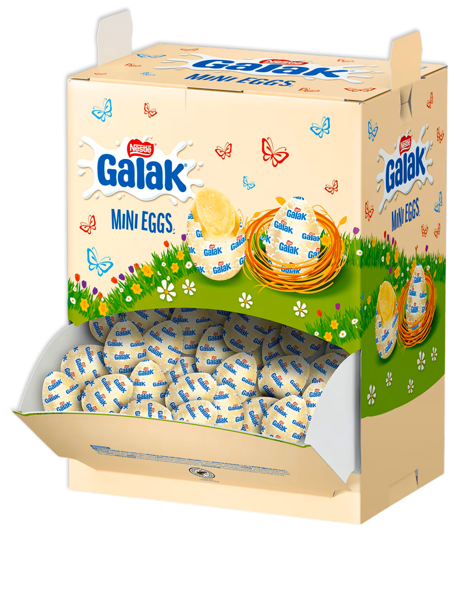 Box espositore Nestlé Galak Mini Eggs da 1,6 kg con almeno 160 mini ovetti di cioccolato bianco Galak ripieni al latte. Ideale per negozi, bar, feste ed eventi, grazie alla pratica confezione marsupio bocca di lupo che si trasforma in display da banco. Perfetti per Pasqua e per ogni momento di dolcezza da condividere.