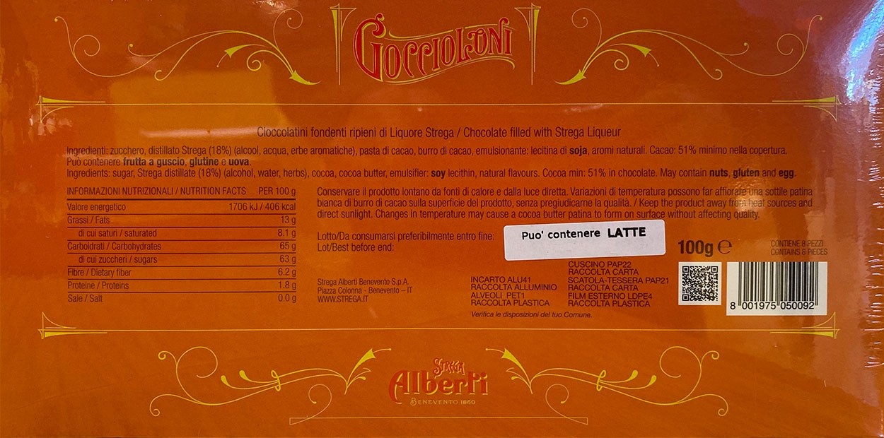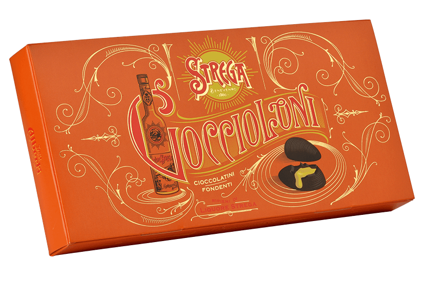 Zucchero, distillato Strega (18%) ( alcool, acqua, erbe aromatiche), pasta di cacao, burro di cacao, emulsionante: lecitina di soja, aromi naturali. Cacao: 51% minimo nella copertura. Può contenere frutta a guscio, glutine, latte e uova.