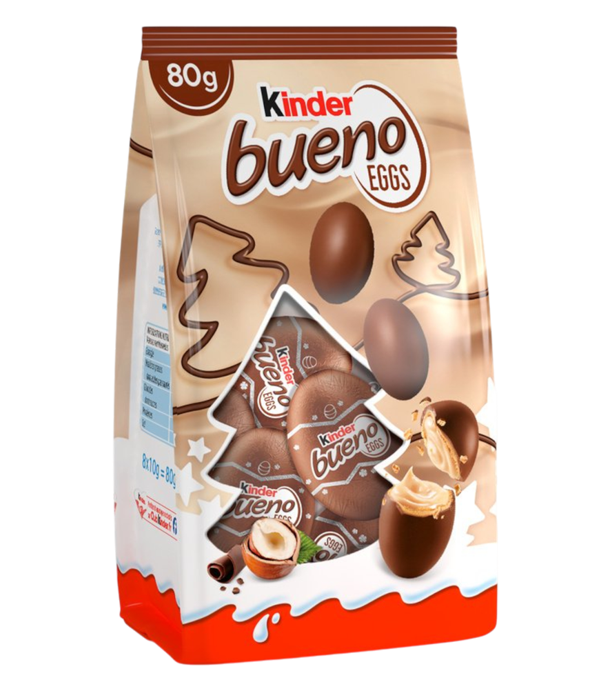 Scopri la delizia dei Kinder Bueno Eggs, una squisita variante del classico cioccolato Kinder in formato uovo. Questa confezione da 80g contiene piccoli ovetti di cioccolato al latte con un irresistibile ripieno di crema alla nocciola e cereali croccanti, la stessa combinazione amata nel tradizionale Kinder Bueno. Perfetti per una pausa golosa, da condividere con amici e famiglia o semplicemente per concedersi un momento di dolcezza.
