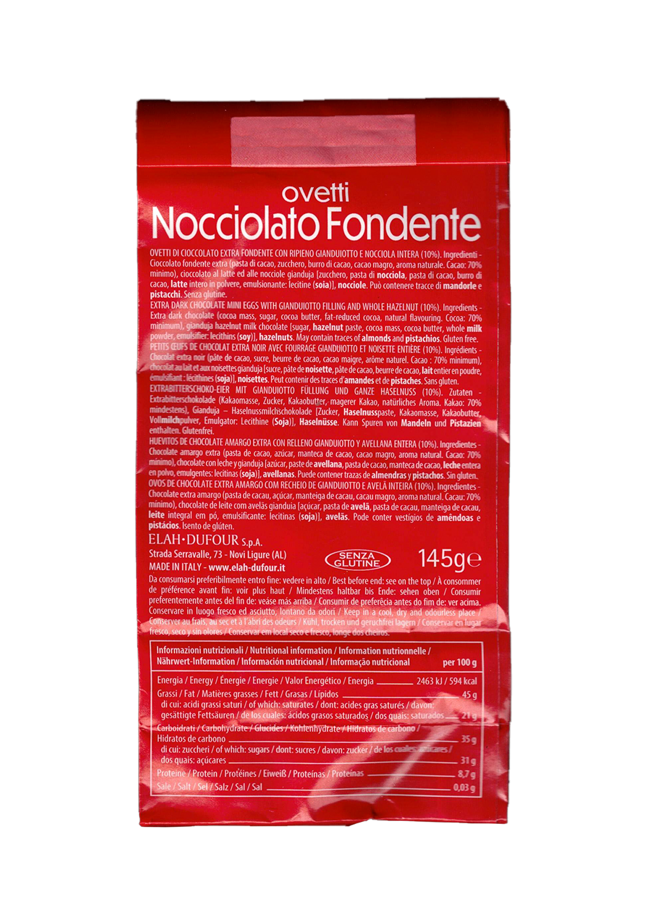 Gli Ovetti Nocciolato Fondente di Novi rappresentano l’eccellenza della tradizione cioccolatiera italiana dal 1905. Questi deliziosi ovetti racchiudono un’esperienza di gusto unica: un guscio di cioccolato extra fondente al 70% che avvolge un morbido ripieno gianduiotto e una nocciola intera italiana. Ogni boccone offre il perfetto equilibrio tra l’intensità del cioccolato fondente di alta qualità e la dolcezza cremosa del gianduiotto, completato dal croccante della nocciola. Ideali per gli amanti del cioccolato fondente che cercano un prodotto raffinato e autentico, questi ovetti sono anche adatti a chi segue una dieta senza glutine. La confezione da 145g è perfetta per concedersi un momento di puro piacere o per condividere con chi ami la vera passione per il grande cioccolato italiano. Novi continua a portare avanti la sua tradizione di qualità, selezionando ingredienti pregiati per creare cioccolato che conquista i palati più esigenti.
