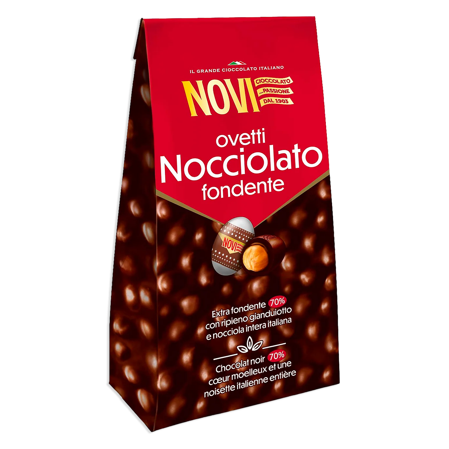 Gli Ovetti Nocciolato Fondente di Novi rappresentano l’eccellenza della tradizione cioccolatiera italiana dal 1905. Questi deliziosi ovetti racchiudono un’esperienza di gusto unica: un guscio di cioccolato extra fondente al 70% che avvolge un morbido ripieno gianduiotto e una nocciola intera italiana!