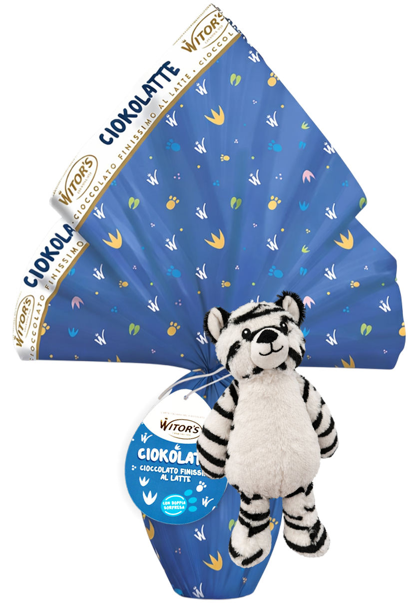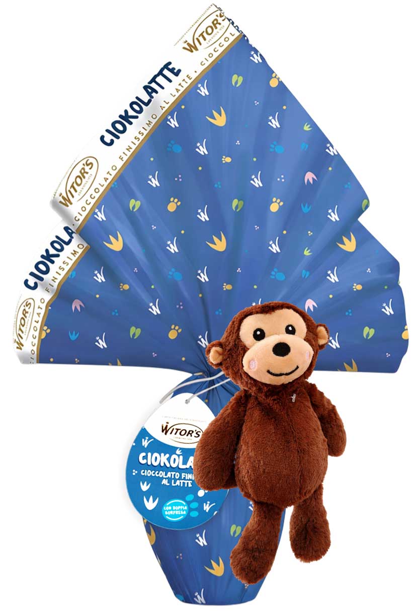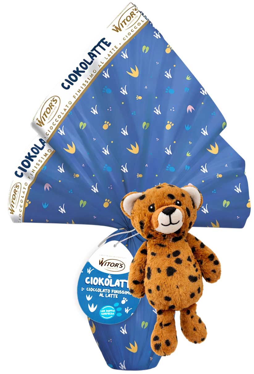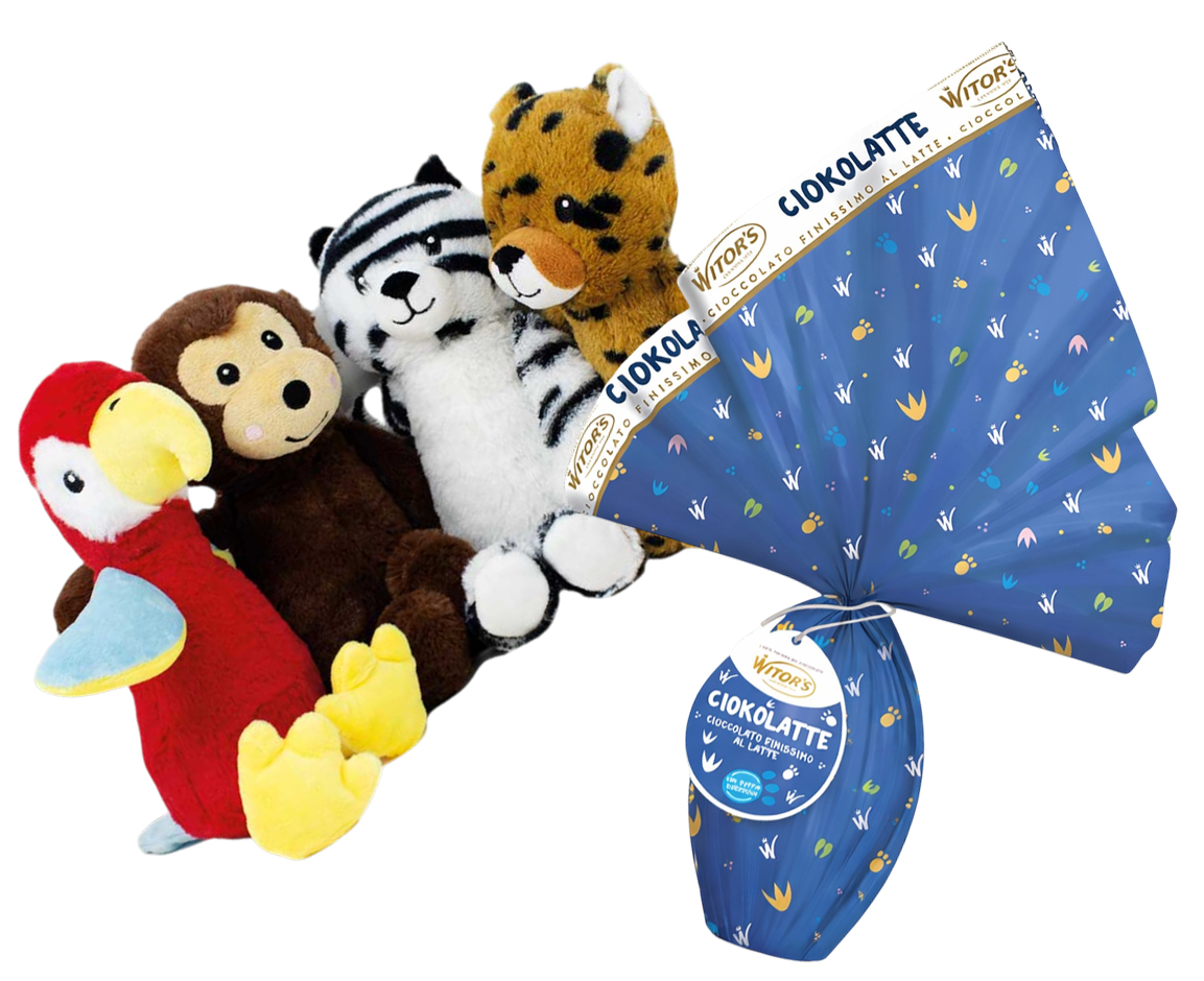 Rendi la Pasqua ancora più speciale con l’uovo di Pasqua Witor’s CIOKOLATTE da 240g in finissimo cioccolato al latte. Un prodotto pensato per unire gusto, qualità e divertimento in un’unica confezione regalo. Il guscio è realizzato con delizioso cioccolato al latte finissimo, cremoso e dal sapore equilibrato, perfetto per grandi e piccini. All’interno troverai una sorpresa dedicata al mondo dei bambini. In più, l’uovo è arricchito da un simpatico peluche esterno applicato alla confezione, disponibile in diverse varianti animaletto (pappagallo, scimmietta, tigrotto, zebra, leopardo).