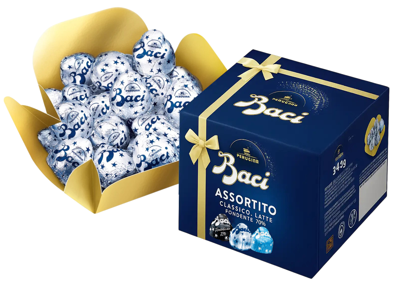 Scopri l’elegante cubo regalo Baci Perugina ASSORTITO, una squisita selezione di cioccolatini che comprende tre varianti irresistibili: il classico Bacio fondente, il delicato Bacio al latte vellutato e l’intenso Bacio fondente 70%. Questa raffinata confezione da 343g racchiude la maestria cioccolatiera italiana in un’esperienza di gusto unica. Ogni cioccolatino è avvolto individualmente in un caratteristico involucro blu stellato, preservando la freschezza e l’aroma intenso del cioccolato.