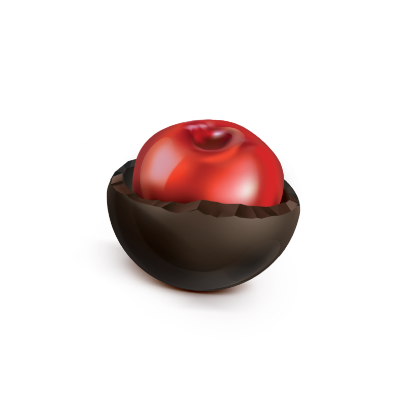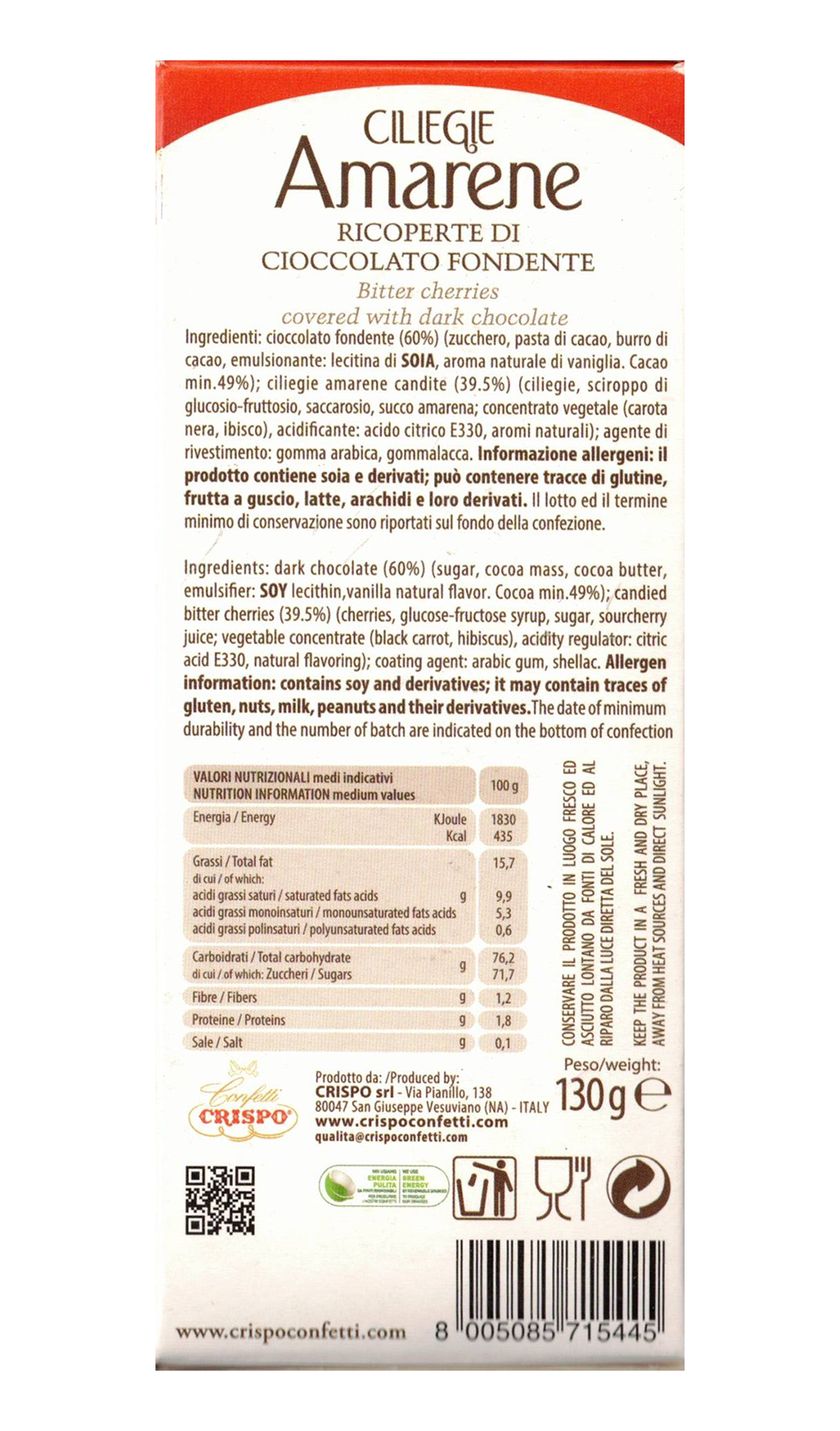 Cioccolato fondente (60%) (zucchero, pasta di cacao, burro di cacao, emulsionante: lecitina di SOIA, aroma naturale di vaniglia. Cacao min.49%); ciliegie amarene candite (40%) (ciliegie, sciroppo di glucosio-fruttosio, saccarosio, succo amarena; concentrato vegetale (carota nera, ibisco), acidificante: acido citrico E330, aromi naturali); agente di rivestimento: gomma arabica, gommalacca.