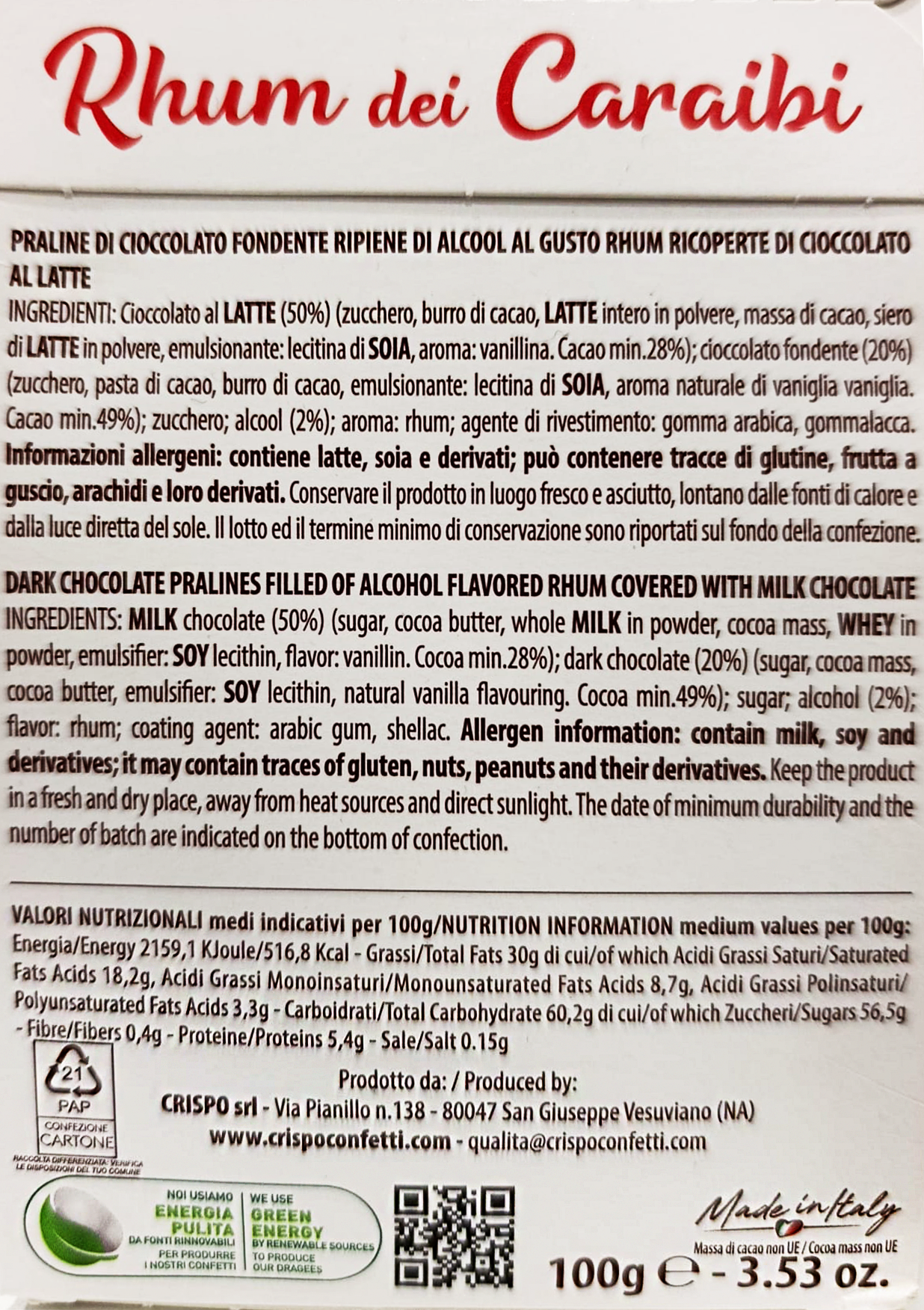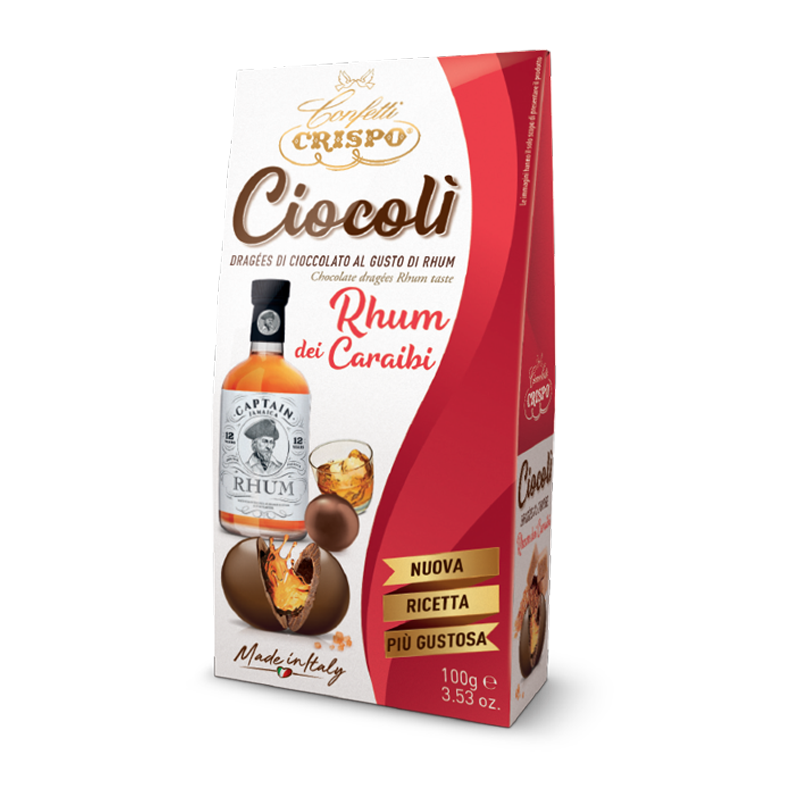 Scopri i deliziosi Ciocolì di Confetti Crispo, praline di cioccolato fondente ripiene di Rhum dei Caraibi. Questa nuova ricetta ancora più gustosa offre un’esperienza di degustazione unica che combina la ricchezza del cioccolato con il raffinato aroma del Rhum. Ogni confezione da 100g contiene queste squisite praline prodotte in Italia, perfette per un momento di puro piacere o come regalo elegante per gli amanti del cioccolato!