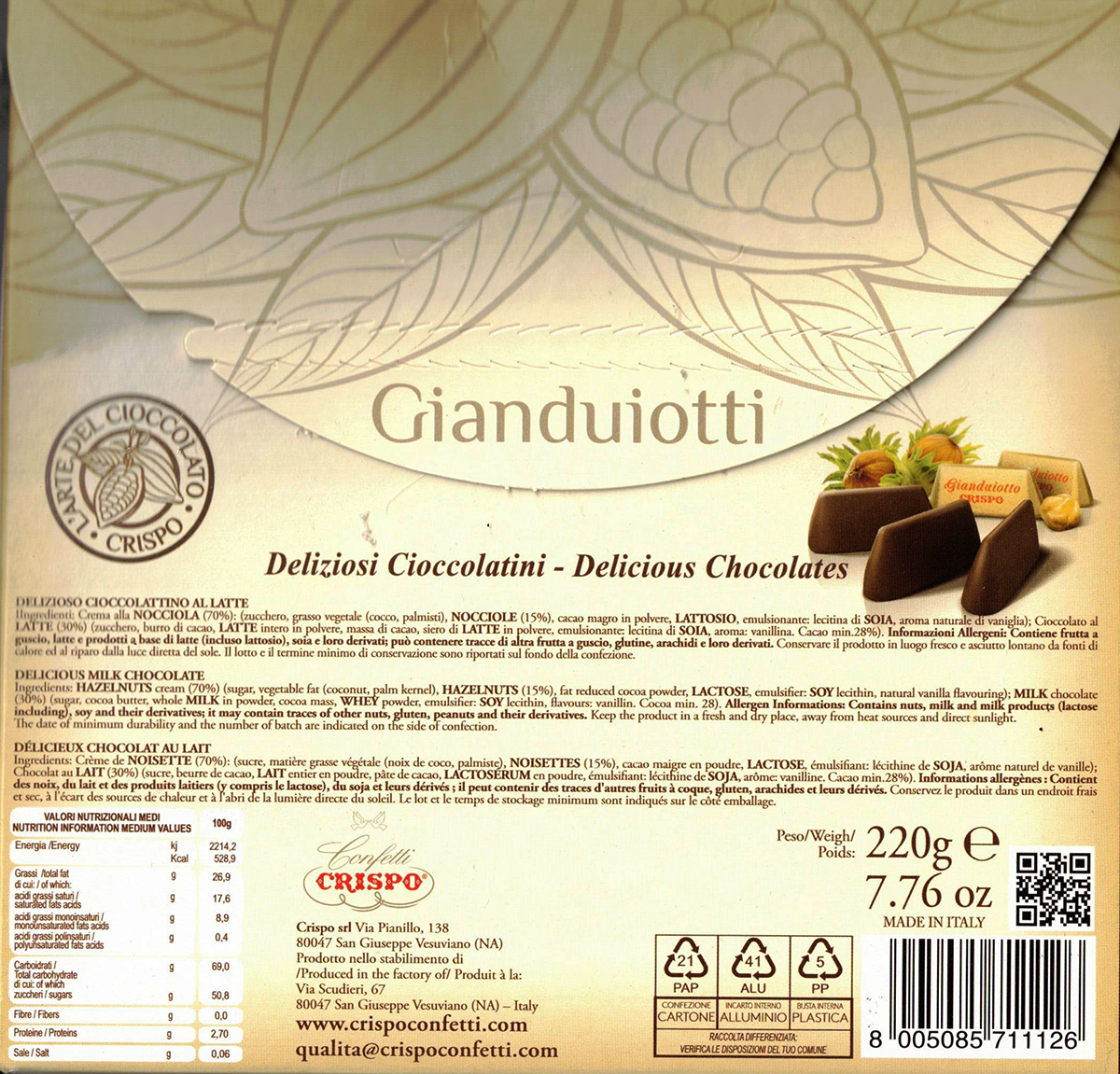 I Gianduiotti Crispo sono deliziosi cioccolatini alla nocciola gianduja presentati in un’elegante borsetta da 220g, perfetti per ogni occasione speciale. Questi raffinati cioccolatini combinano la tradizione italiana del cioccolato gianduia con la qualità artigianale Crispo, creando un’esperienza di gusto unica e indimenticabile!