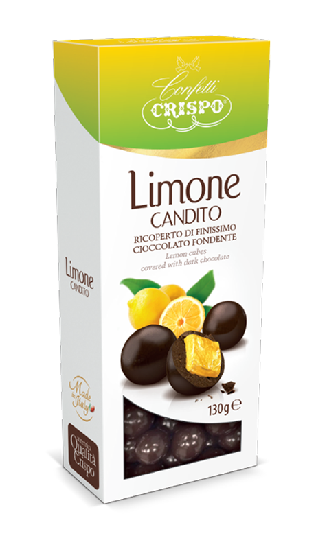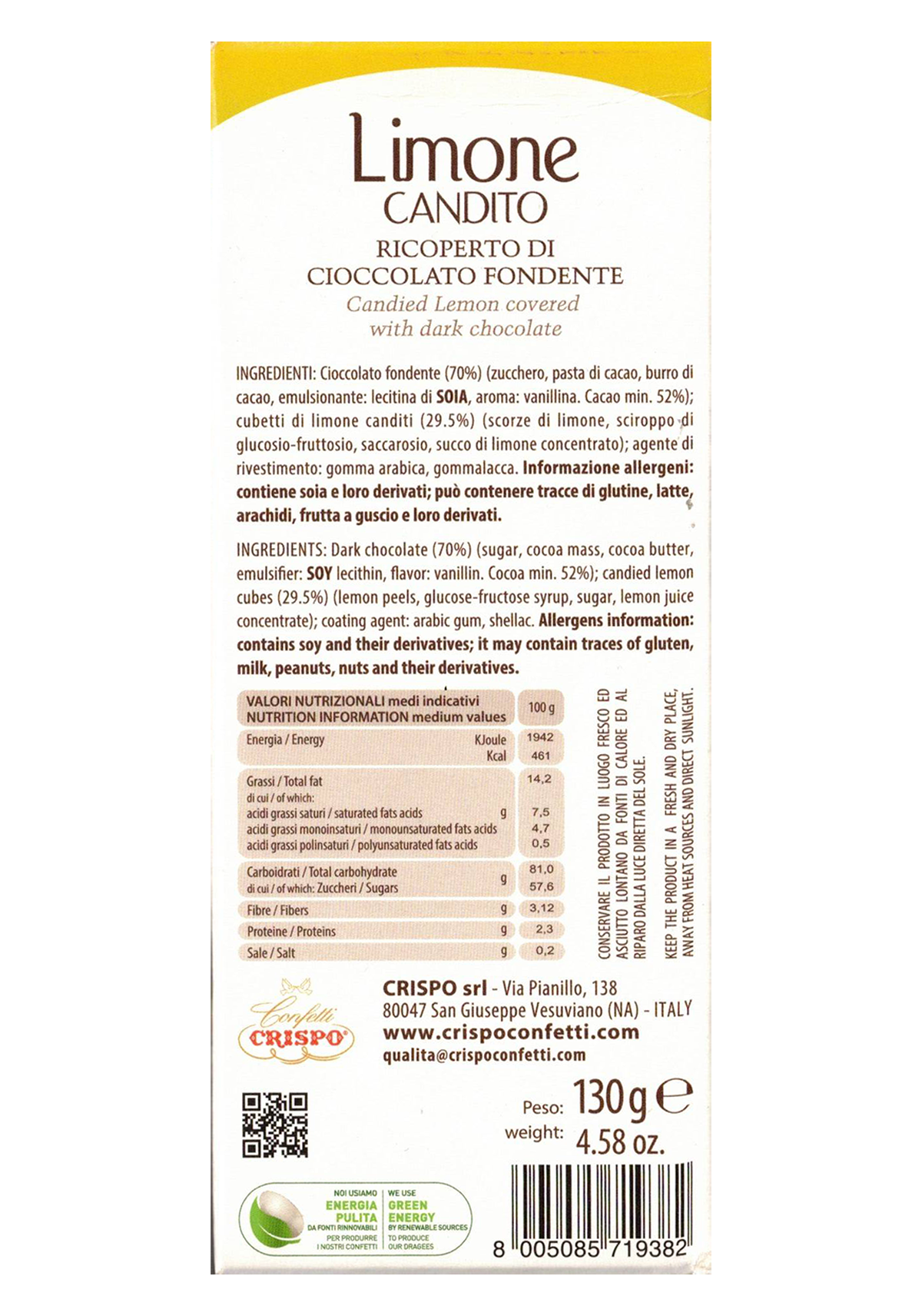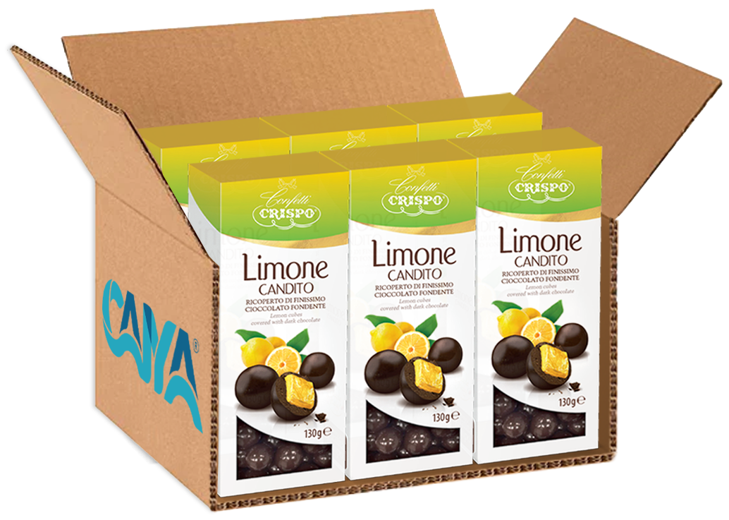 | Tipologia: | Crispo Limone Candito Ricoperto di Cioccolato Fondente 130g, CAIYA Box da 6 Confezioni |