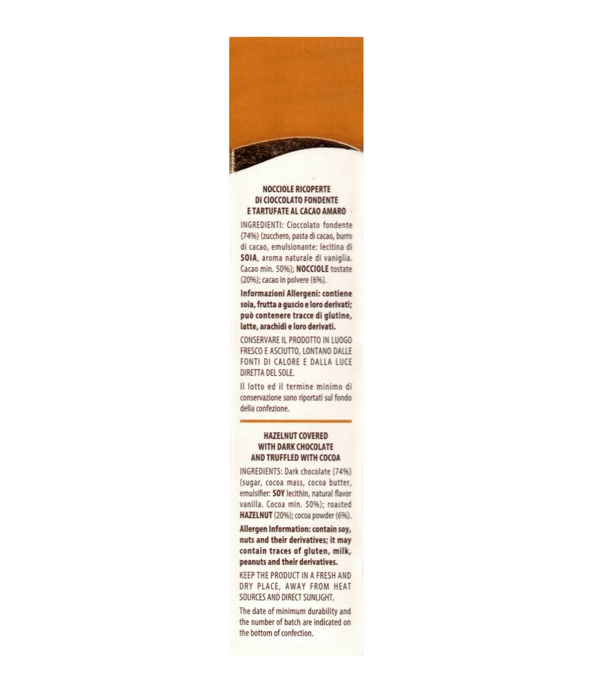 Ingredienti: Cioccolato al fondente (75%) (zucchero, pasta di cacao, burro di cacao, emulsionante: lecitina di SOIA, aroma:vanillina)cacao in polvere; NOCCIOLA tostata (25%).