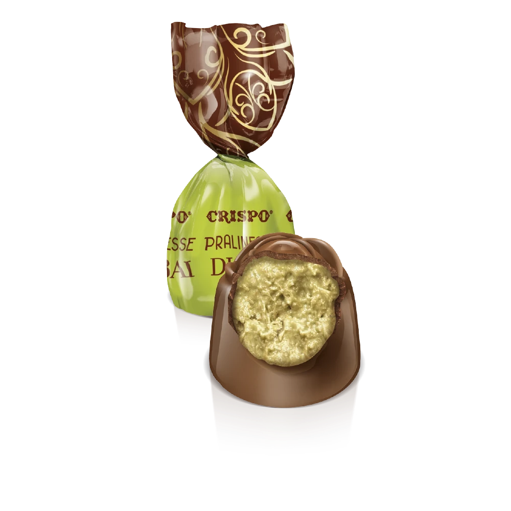 Le Pralinesse Dubai Style di Crispo rappresentano un’esperienza di gusto raffinata e contemporanea. Queste pregiate praline di cioccolato al latte racchiudono un ripieno cremoso di pistacchio arricchito con pasta Kadayif, il tradizionale ingrediente che conferisce una texture croccante e distintiva ispirata ai dolci mediorientali. Ogni pralina è un piccolo capolavoro che combina la dolcezza del cioccolato con l’intensità del pistacchio e la delicata croccantezza della Kadayif!