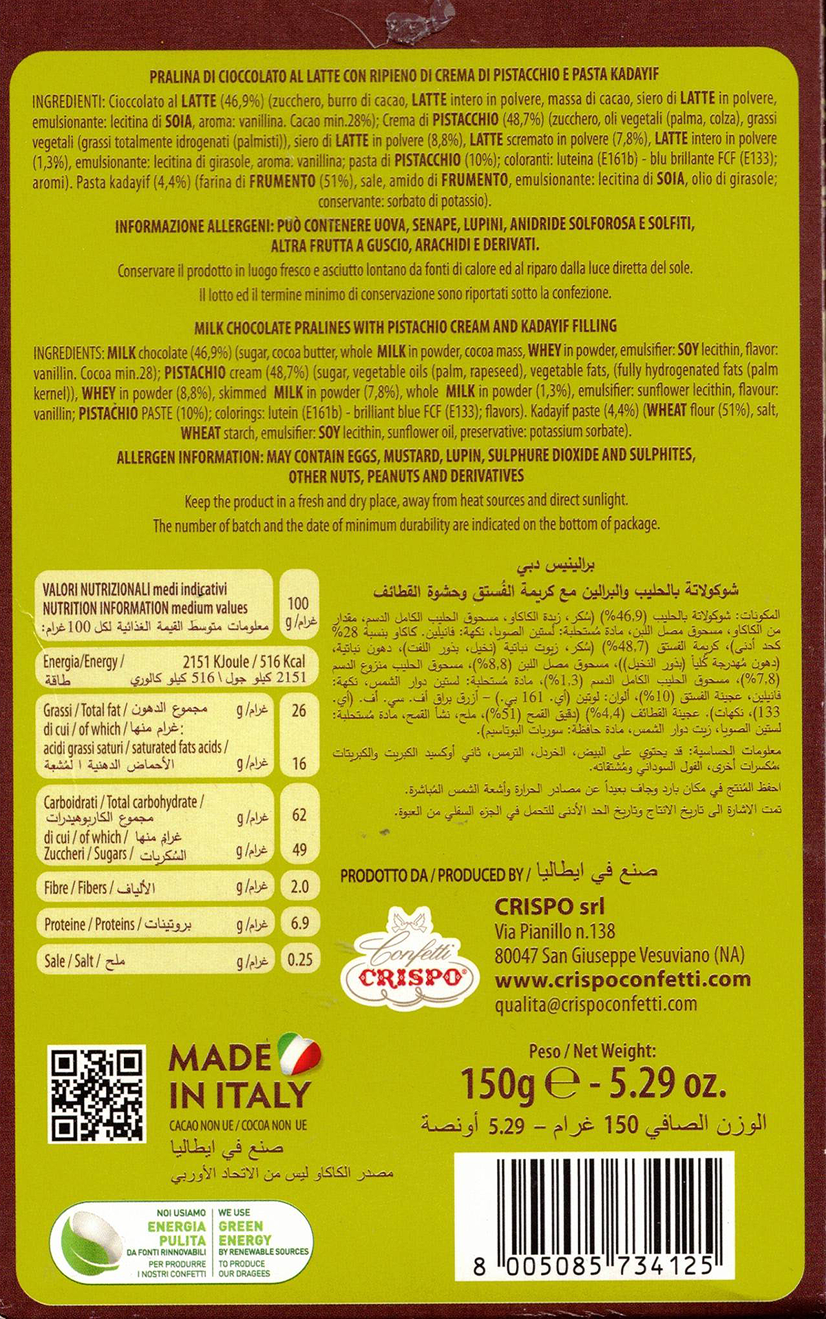 Le Pralinesse Dubai Style di Crispo rappresentano un’esperienza di gusto raffinata e contemporanea. Queste pregiate praline di cioccolato al latte racchiudono un ripieno cremoso di pistacchio arricchito con pasta Kadayif, il tradizionale ingrediente che conferisce una texture croccante e distintiva ispirata ai dolci mediorientali. Ogni pralina è un piccolo capolavoro che combina la dolcezza del cioccolato con l’intensità del pistacchio e la delicata croccantezza della Kadayif. Confezionate in un’elegante shopper da 150g, queste praline sono perfette come regalo raffinato o per concedersi un momento di puro piacere. La confezione contiene circa 8 pezzi, ideali per condividere o assaporare in momenti speciali. Conservare a temperatura ambiente per mantenere intatte tutte le caratteristiche organolettiche del prodotto. Un’autentica delizia che unisce la tradizione italiana del cioccolato con i sapori esotici del Medio Oriente.