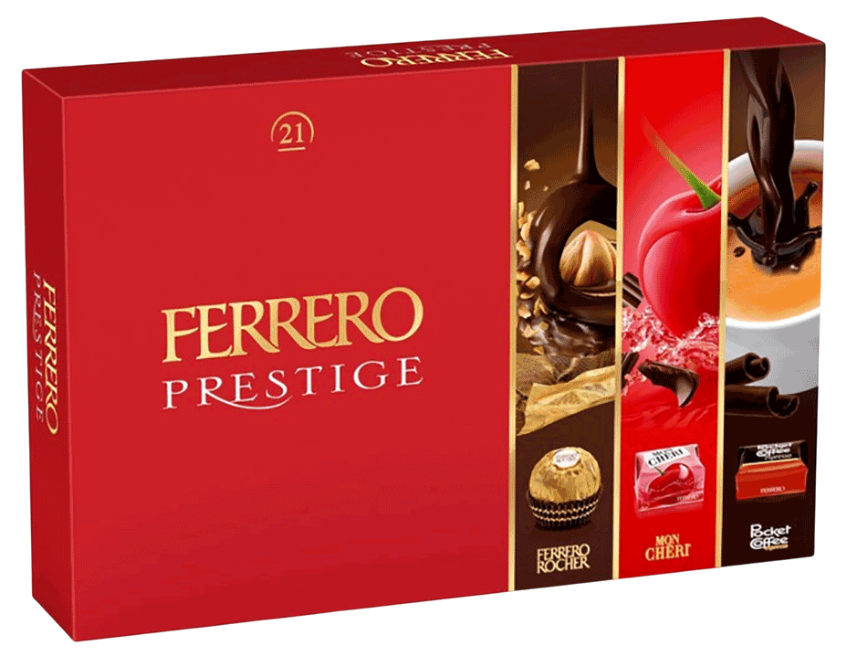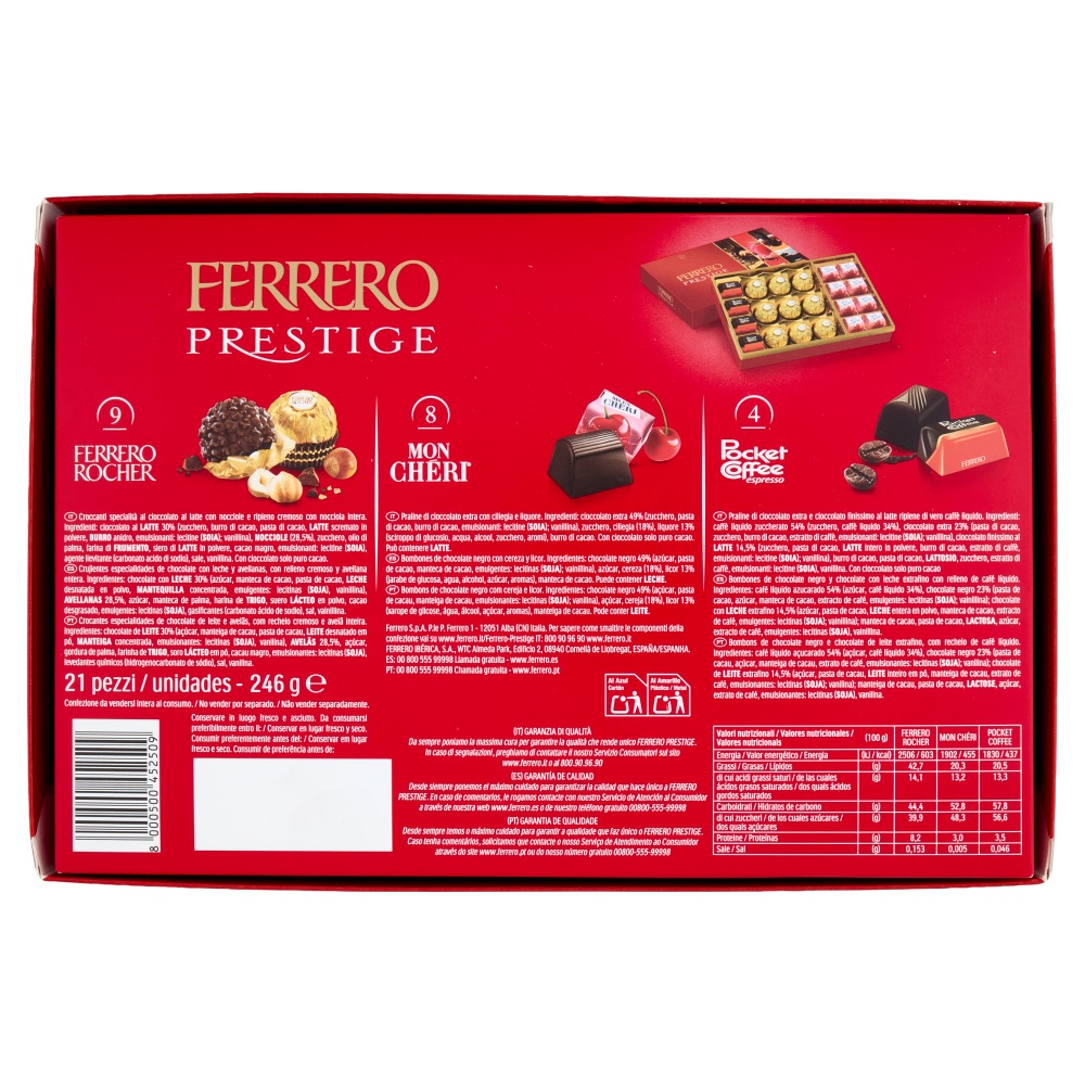 Scopri l’eleganza di Ferrero Prestige, una raffinata selezione di 21 prelibati cioccolatini assortiti racchiusi in un’elegante confezione regalo rossa con finiture dorate. Questa lussuosa scatola da 246g contiene tre varietà iconiche: i classici Ferrero Rocher con il loro inconfondibile guscio di nocciola, i deliziosi Mon Chéri ripieni al liquore e ciliegia, e gli energetici Pocket Coffee con il loro cuore di vero espresso. Ogni cioccolatino è stato accuratamente selezionato per offrire un’esperienza di gusto unica e indimenticabile. La confezione elegante rende questo assortimento il regalo perfetto per occasioni speciali, celebrazioni o semplicemente per deliziare i vostri cari con un tocco di lusso italiano. Un’armoniosa combinazione di sapori che rappresenta l’eccellenza della tradizione dolciaria Ferrero.