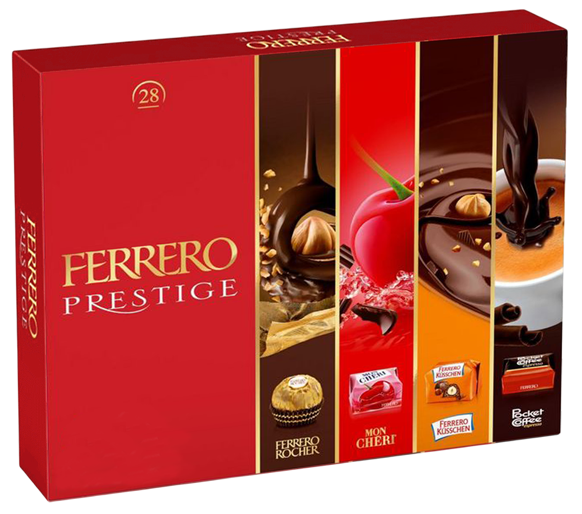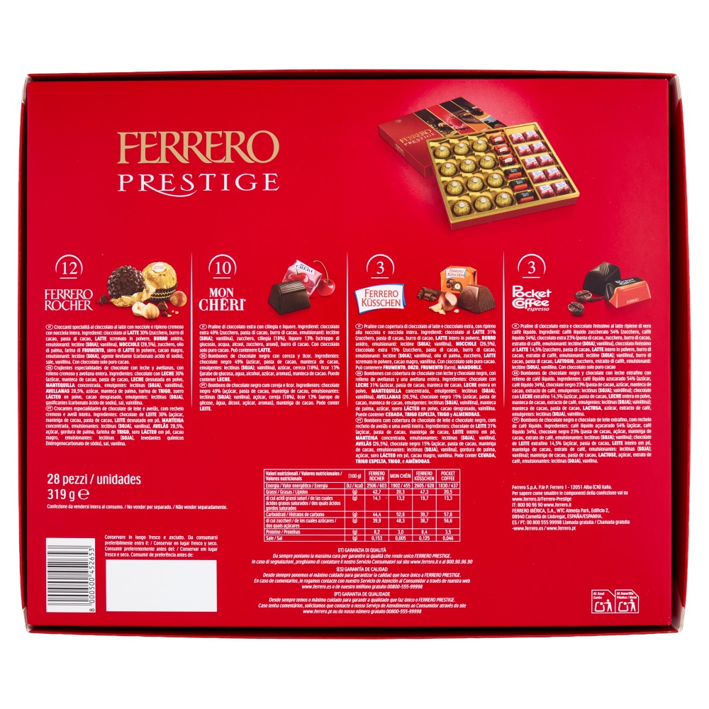 Scopri l’eleganza di Ferrero Prestige, una raffinata selezione di 21 prelibati cioccolatini assortiti racchiusi in un’elegante confezione regalo rossa con finiture dorate. Questa lussuosa scatola da 246g contiene tre varietà iconiche: i classici Ferrero Rocher con il loro inconfondibile guscio di nocciola, i golosi Kusschen al cioccolato a latte e i deliziosi Mon Chéri ripieni al liquore e ciliegia, e gli energetici Pocket Coffee con il loro cuore di vero espresso. Ogni cioccolatino è stato accuratamente selezionato per offrire un’esperienza di gusto unica e indimenticabile. La confezione elegante rende questo assortimento il regalo perfetto per occasioni speciali, celebrazioni o semplicemente per deliziare i vostri cari con un tocco di lusso italiano. Un’armoniosa combinazione di sapori che rappresenta l’eccellenza della tradizione dolciaria Ferrero.