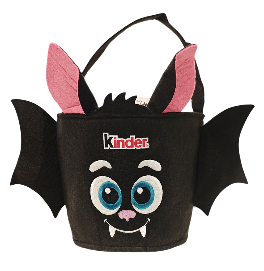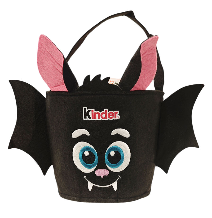 Porta dolcezza e divertimento questo Halloween con la deliziosa borsetta Kinder! Disponibile in due vivaci varianti – arancione allegro con un sorriso amichevole o nero elegante con un simpatico pipistrello – questa adorabile borsetta in feltro è piena di prelibatezze Kinder. All’interno troverai una squisita selezione di 218g di dolciumi, tra cui Kinder Bueno, cioccolato, Kinder Maxi, snack ai cereali e confettini.
