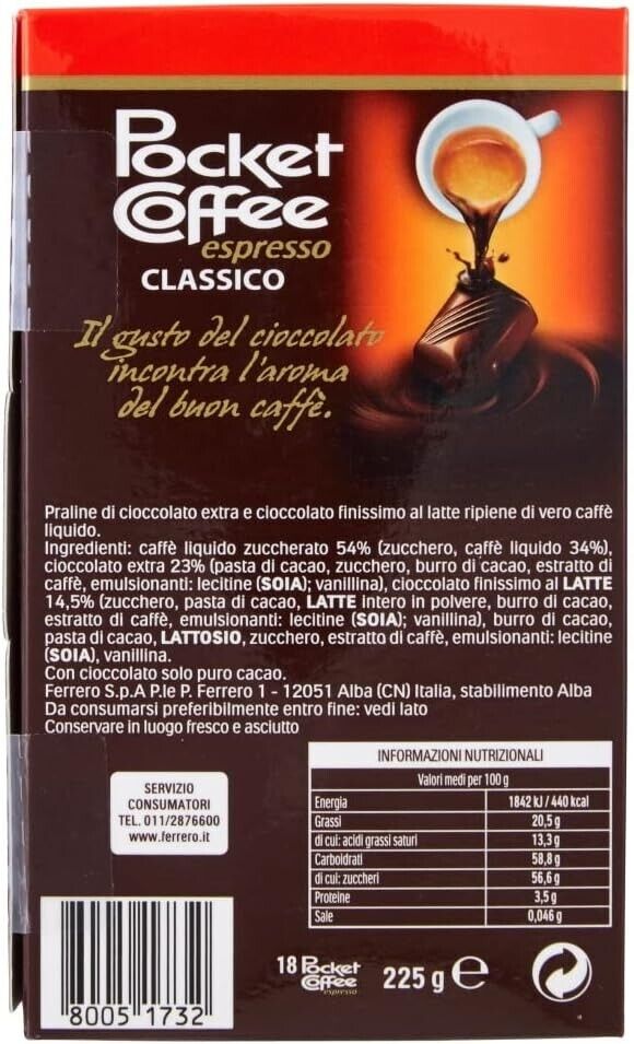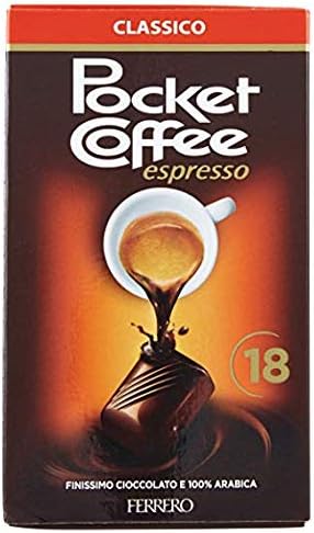Scopri l’irresistibile Pocket Coffee Espresso, una deliziosa fusione di cioccolato finissimo e vero caffè espresso liquido. Ogni confezione contiene 18 praline di cioccolato extra riempite con autentico caffè 100% Arabica, creando un’esperienza di gusto unica e lussuosa. Realizzato con maestria da Ferrero, ogni cioccolatino racchiude il perfetto equilibrio tra il ricco aroma del caffè e la dolcezza del cioccolato al latte. La confezione da 225g è ideale per gli amanti del caffè che cercano un’esperienza gourmand raffinata. Perfetto come snack energetico durante la giornata o come elegante conclusione di un pasto. Il cioccolato finissimo si scioglie delicatamente rivelando un cuore di vero espresso italiano. Conservare in luogo fresco e asciutto per mantenere intatta la qualità superiore del prodotto.