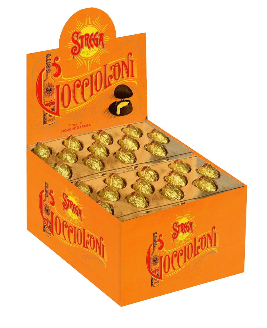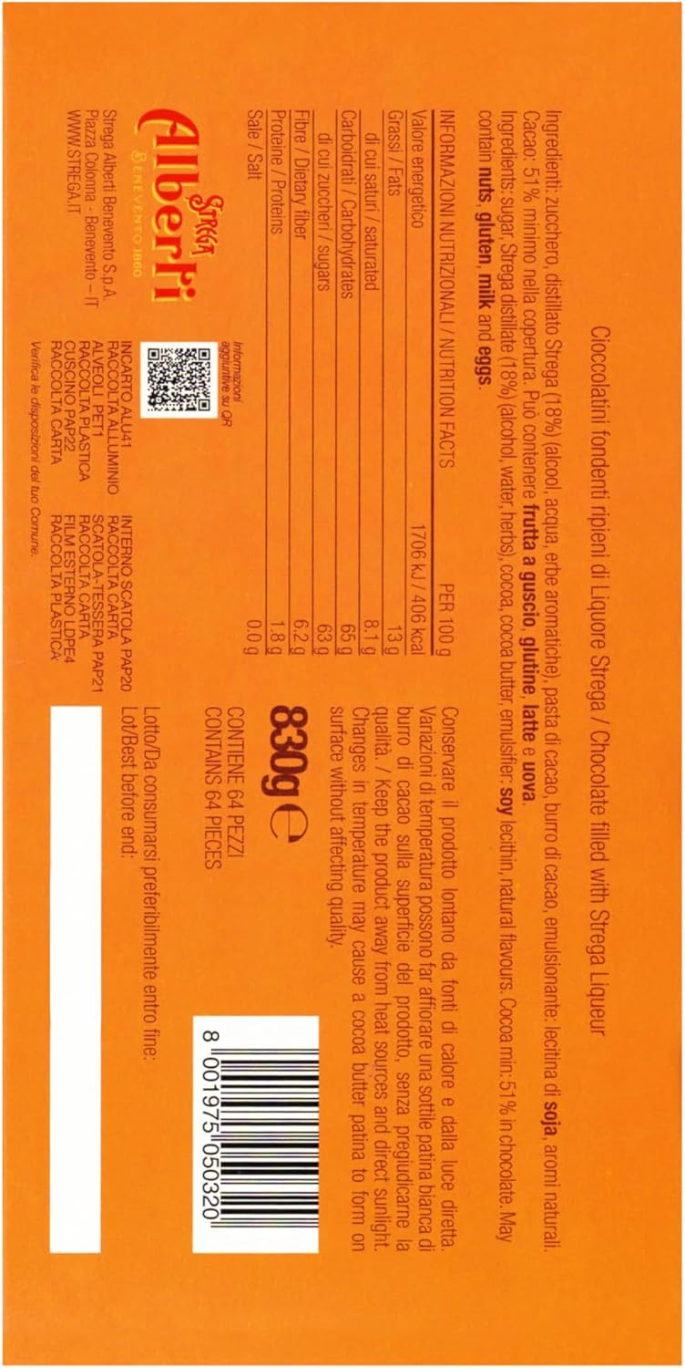 Zucchero, distillato Strega (18%) ( alcool, acqua, erbe aromatiche), pasta di cacao, burro di cacao, emulsionante: lecitina di soja, aromi naturali. Cacao: 51% minimo nella copertura. Può contenere frutta a guscio, glutine, latte e uova.