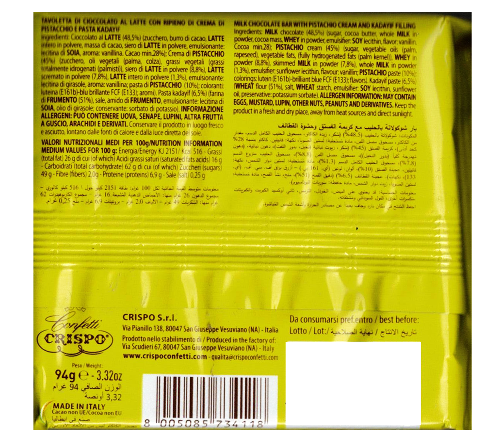 La Tavoletta Dubai Style di Crispo rappresenta un’esperienza di gusto raffinata e contemporanea. Ogni tavoletta è un piccolo capolavoro che combina la dolcezza del cioccolato con l’intensità del pistacchio e la delicata croccantezza della Kadayif. Conffezione perfetta come regalo raffinato o per concedersi un momento di puro piacere. Conservare a temperatura ambiente per mantenere intatte tutte le caratteristiche organolettiche del prodotto. Un’autentica delizia che unisce la tradizione italiana del cioccolato con i sapori esotici del Medio Oriente!
