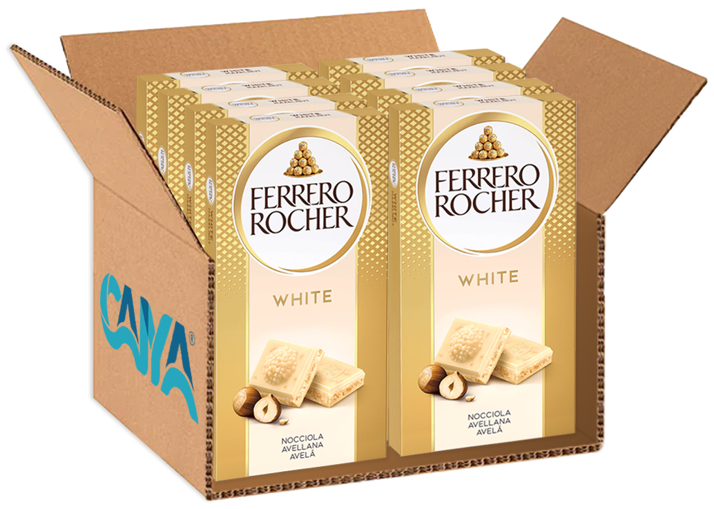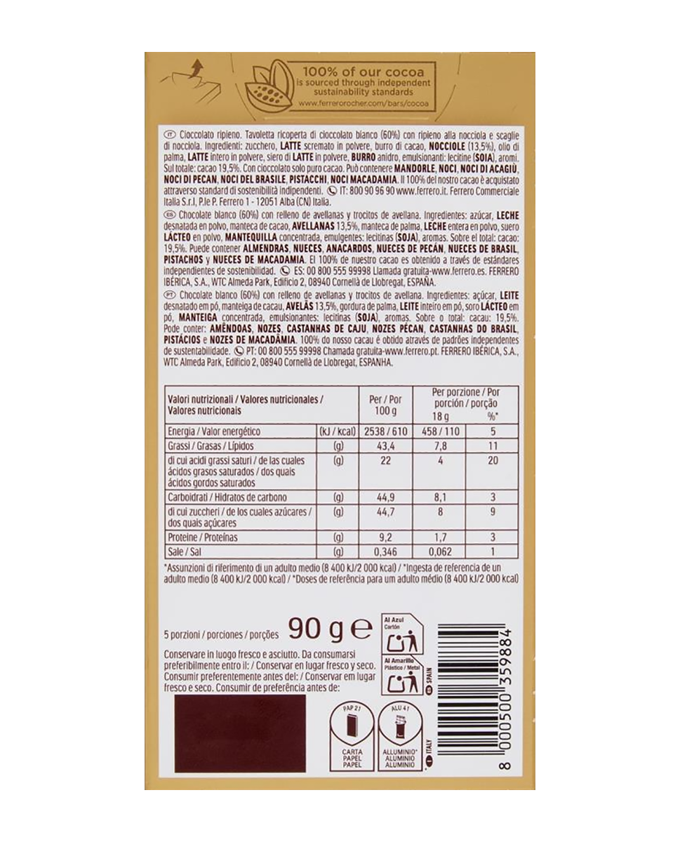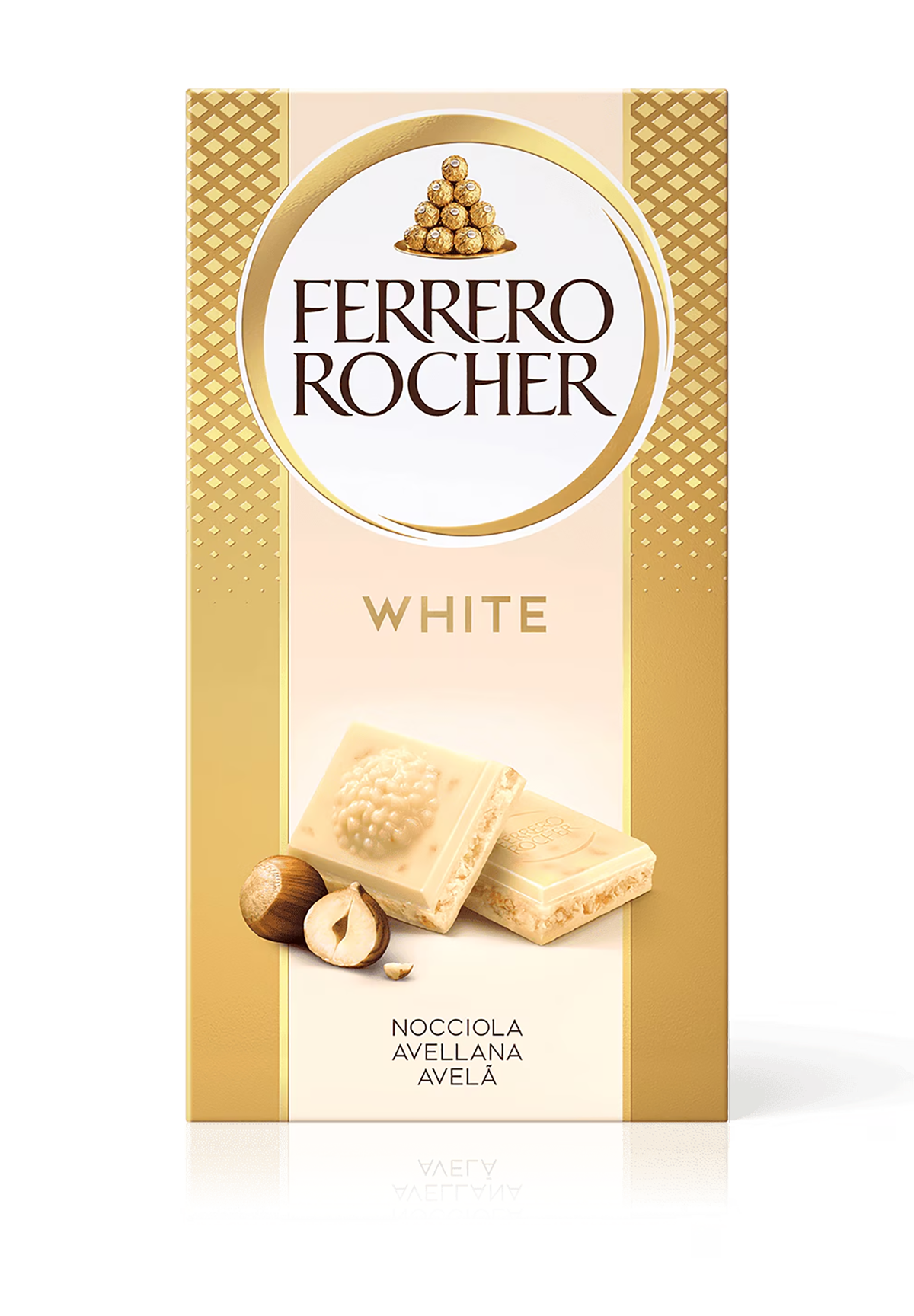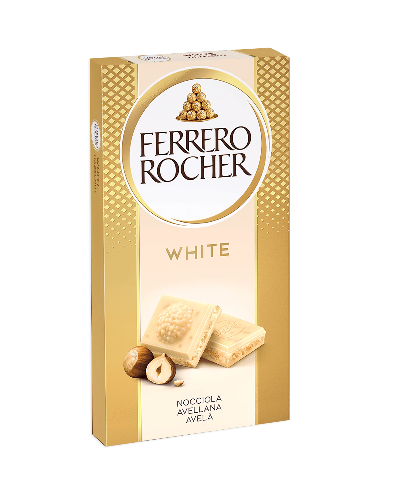 Tipologia: | Ferrero Rocher White Tavoletta di Cioccolato Bianco con Ripieno alla Nocciola 90g, BOX da 8 Tavolette |