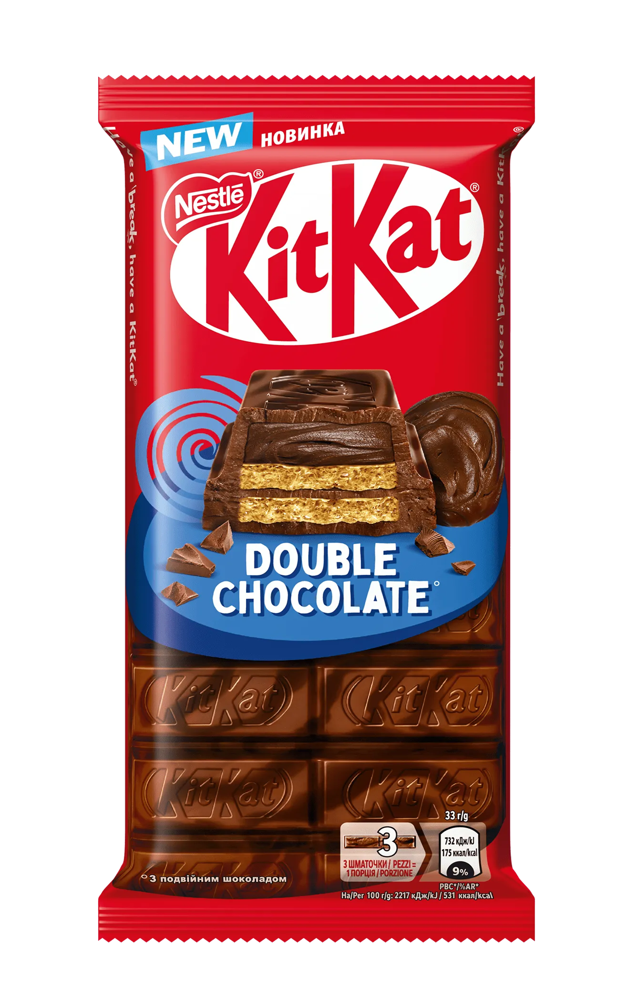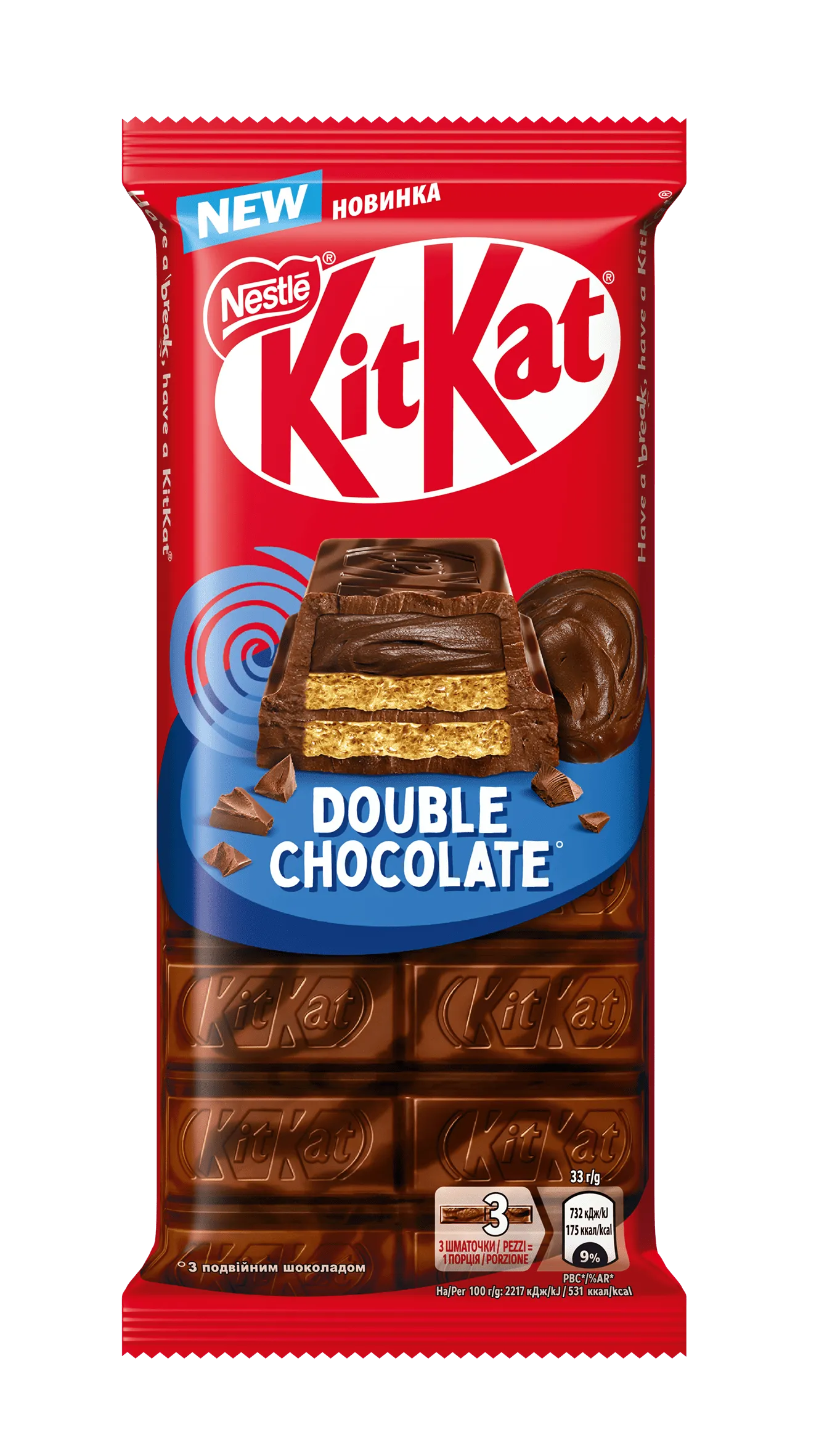 Scopri il delizioso Kit Kat Double Chocolate, una tavoletta da 99g che unisce il croccante del wafer al latte con un doppio strato di cioccolato al latte.