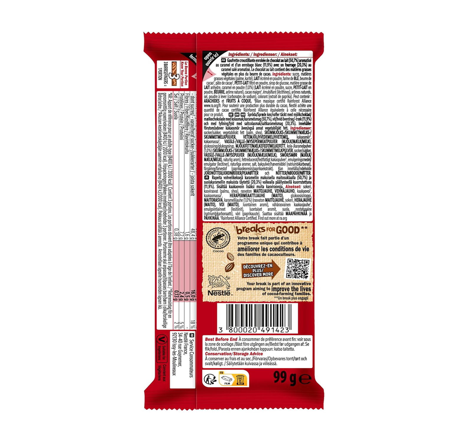Ingredienti: zucchero, grassi vegetali (palma, karité), pasta di cacao*, farina di FRUMENTO, burro di cacao*, LATTE scremato in polvere, permeato del siero di LATTE in polvere, sciroppo di glucosio, cacao magro in polvere’, BURRO anidro, emulsionante (lecitine), agente lievitante (carbonati di sodio), aroma naturale. Puo’ contenere ARACHIDI e FRUTTA A GUSCIO.