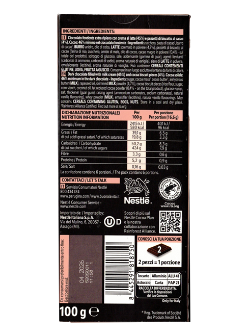 INGREDIENTI: Cioccolato fondente extra ripieno con crema al latte (45%) e pezzetti di biscotto al cacao (4%). Cacao: 46% minimo nel cioccolato fondente – Ingredienti: zucchero, pasta di cacao’, burro di cacao”, BURRO anidro, olio di colza, LATTE scremato in polvere (4,7%), pezzetti di biscotto al cacao farina di riso, zucchero, amido di mais, olio di cocco, cacao magro in polvere (0,4% -sul totale del prodotto), sciroppo di glucosio, sale, addensante (gomma di guar), agenti lievitanti (carbonati di ammonio, carbonati di sodio), aroma naturale di vaniglia), siero di LATTE in polvere, emulsionante (lecitine), aroma naturale di vaniglia. Può contenere CEREALI CONTENENTI GLUTINE, UOVA, FRUTTA A GUSCIO. Conservare in un luogo asciutto e lontano da fonti di calore.