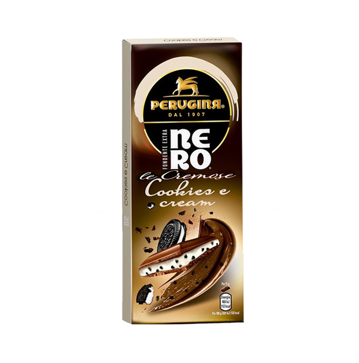 Scopri il piacere irresistibile ella Perugina Nero Tavoletta Le Cremose al Gusto Cookies e Cram che unisce il meglio del cioccolato extra fondente e la cremosità della crema al latte e biscotto. E’ un vero e proprio viaggio sensoriale: ogni morso rivela un cuore morbido di crema al latte, arricchito da croccanti pezzetti di biscotti al cacao che aggiungono una nota di croccantezza e un sapore intenso.