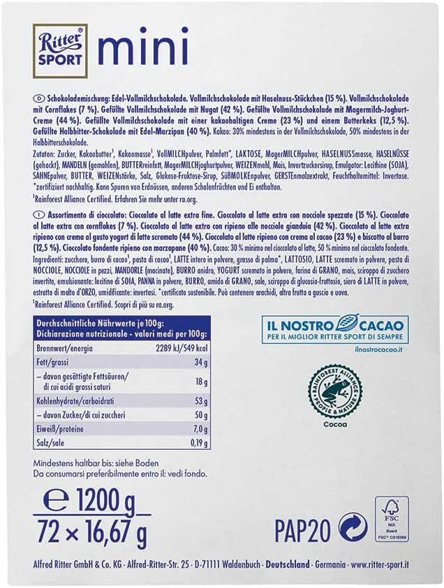 Ingredienti: zucchero, burro di cacao, pasta di cacao, LATTE intero in polvere, grasso di palma*, LATTOSIO, LATTE scremato in polvere, MANDORLE, pasta di NOCCIOLE, yogurt di LATTE scremato in polvere, NOCCIOLE, BURRO anidro, farina di GRANO, mais, PANNA in polvere, sciroppo di zucchero invertito, emulsionante: lecitine di SOIA, BURRO, amido di FRUMENTO, sale, sciroppo di glucosio-fruttosio, estratto di malto d’ORZO, siero di LATTE in polvere, umidificante: invertasi. Può contenere arachidi, altra frutta a guscio e uova.