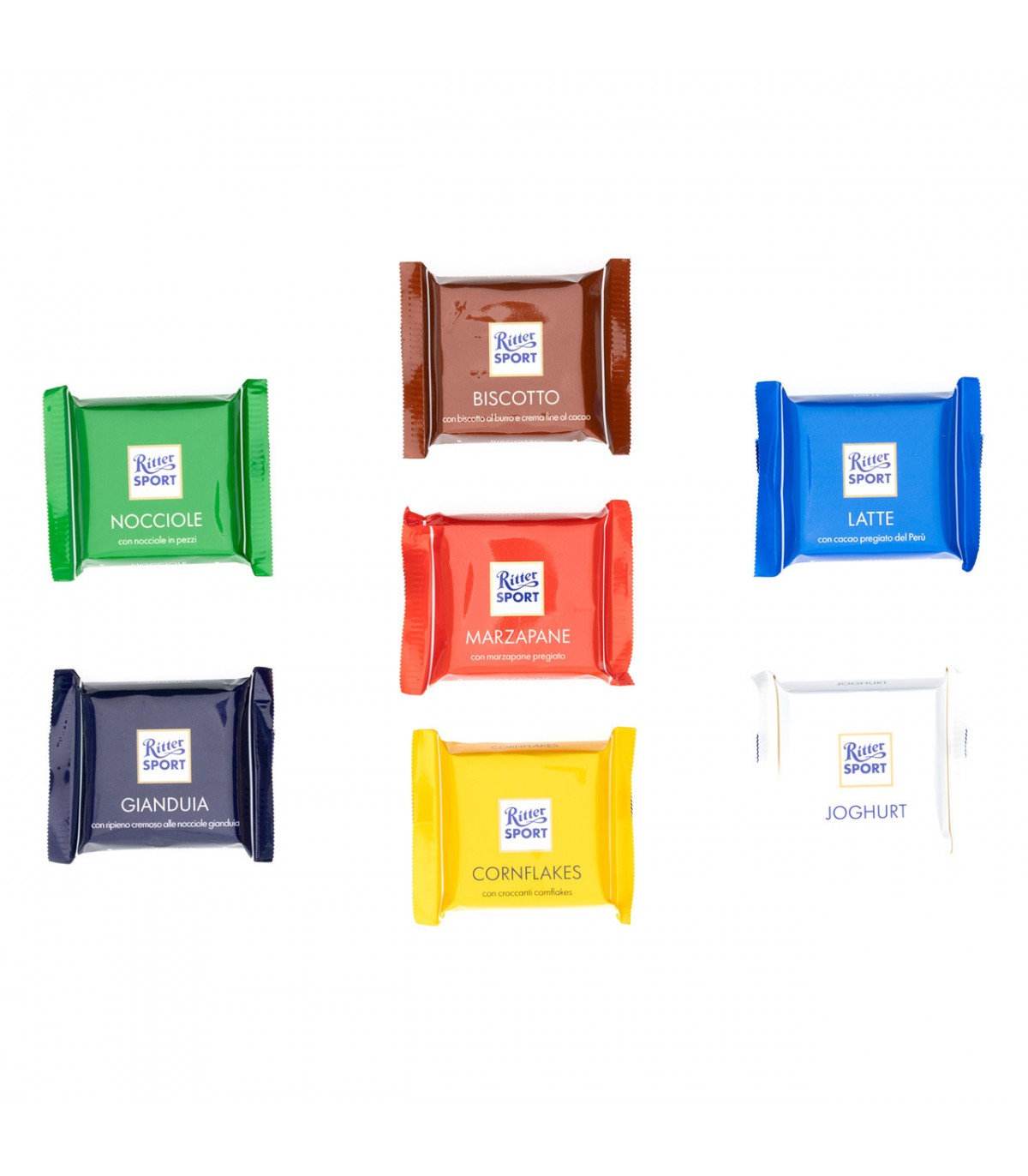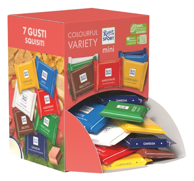 Il compatto espositore da banco Ritter Sport Mini 16,67g contiene tanti golosi assaggi della linea Special Nuts, confezionati uno ad uno per salvaguardarne la freschezza: le golose nocciole, il fresco yogurt, il raffinato gianduia, il croccante cornflakes, il morbido marzapane e il delizioso latte, tanti gusti prelibati che fanno compiere un goloso tour nelle bontà di Ritter Sport senza esagerare. Perfetti come accompagnamento al caffè e per fare una piccola sorpresa mettendoli in tasca o nella borsa, si addicono a un consumo controllato. Queste deliziose piccole bontà trovano la loro collocazione ideale nel banco e nei pressi della cassa.