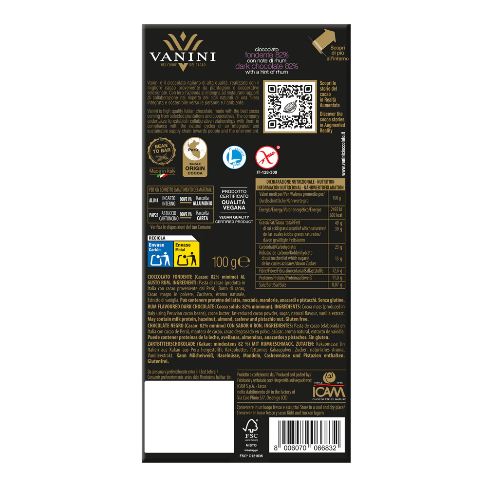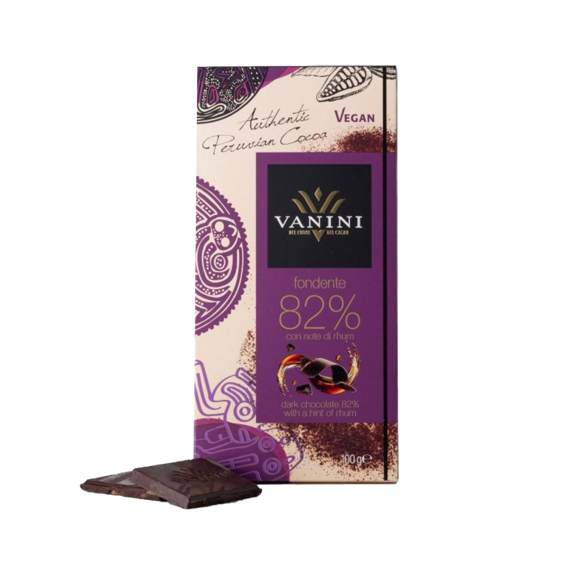 Scopri il piacere intenso della Tavoletta di Cioccolato Fondente 82% di Vanini, realizzata con autentico cacao peruviano. Con note avvolgenti di rhum, questa prelibatezza vegana e senza glutine offre un’esperienza di gusto unica, perfetta per i veri amanti del cioccolato. Ogni morso è un viaggio sensoriale che celebra la qualità e la tradizione, racchiuso in un’elegante confezione con etichetta viola. Delizia il tuo palato e concediti un momento di pura indulgence con questo cioccolato di alta gamma.