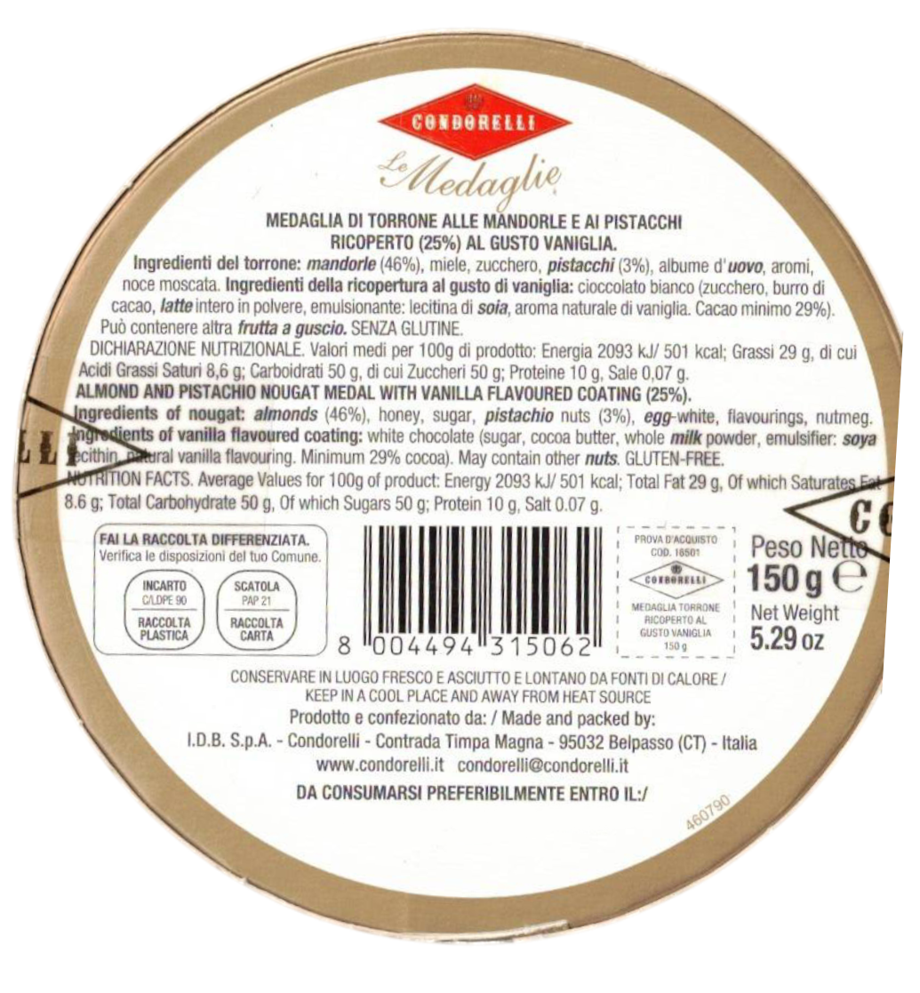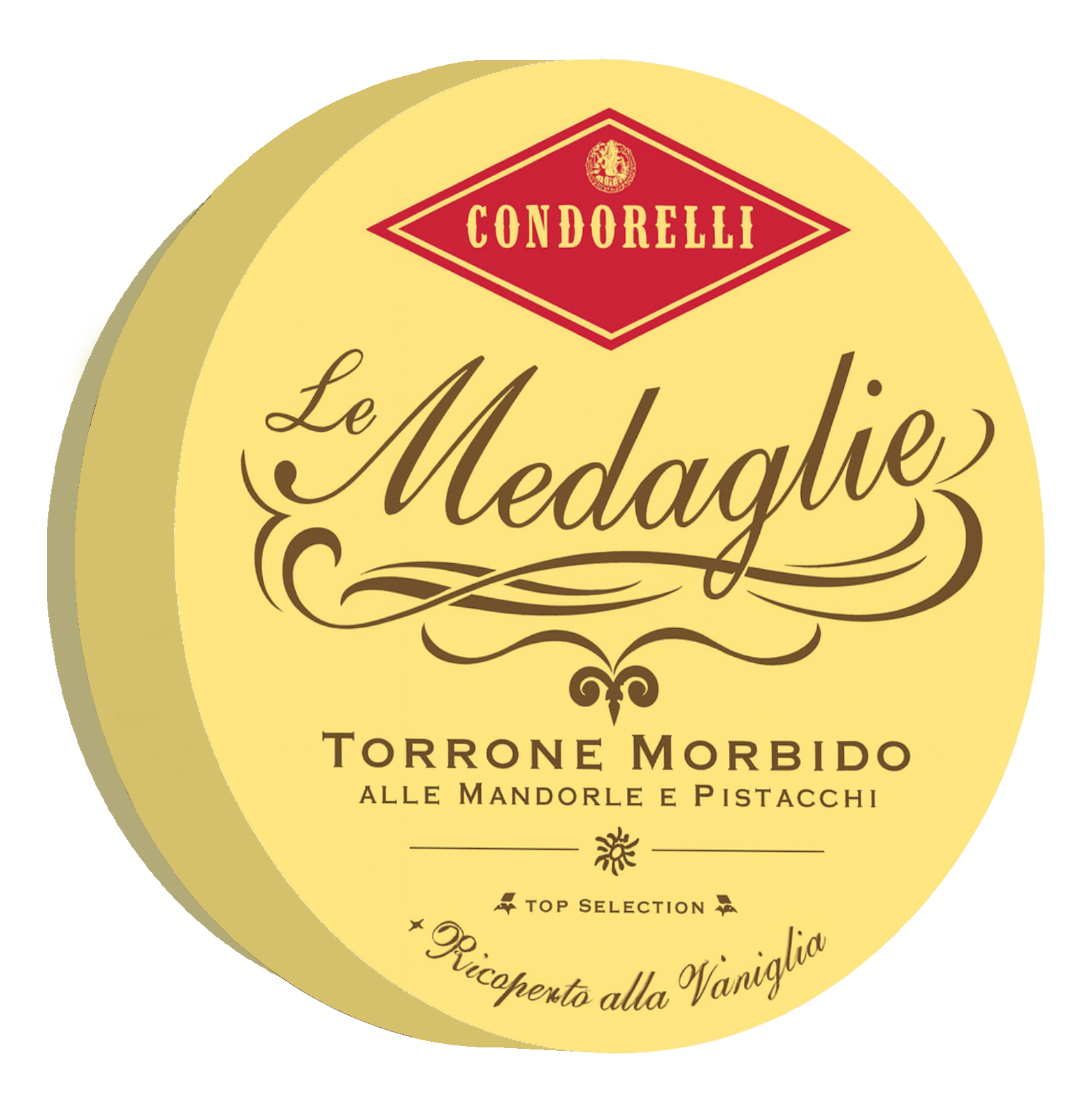Scopri il dolce piacere del Torrone Morbido “Le Medaglie” di Condorelli, un’autentica delizia che unisce la croccantezza delle mandorle e dei pistacchi alla morbidezza di un torrone avvolgente.