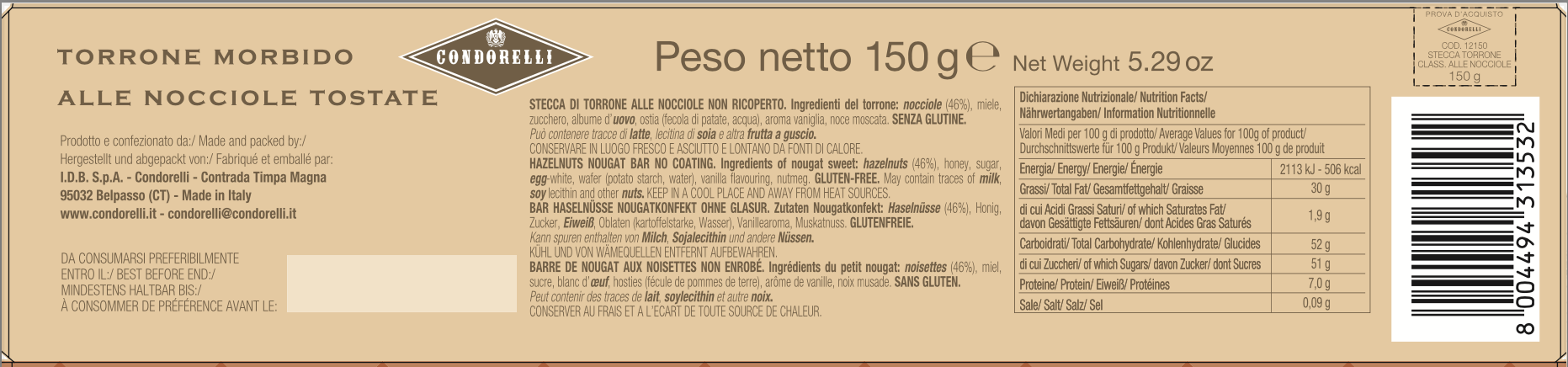 Ingredienti: nocciole (46%), miele, zucchero, albume d’uovo, ostia (fecola di patate, acqua), aroma vaniglia, noce moscata. SENZA GLUTINE. Può contenere tracce di latte, lecitina di soia e altra frutta a guscio.