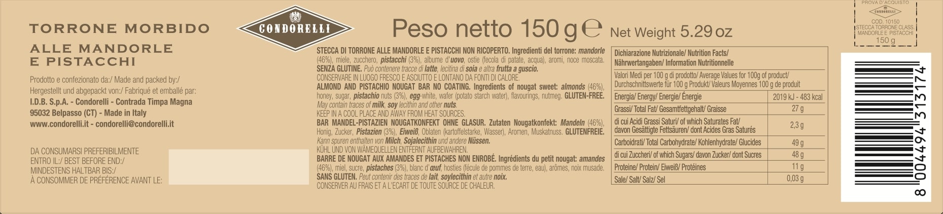 Ingredienti: mandorle 46%, miele, zucchero, pistacchi 3%, albume d’uovo, ostie (fecola di patata, acqua), aromi, noce moscata. Senza glutine. Può contenere latte, lecitina di soia e altra frutta a guscio.