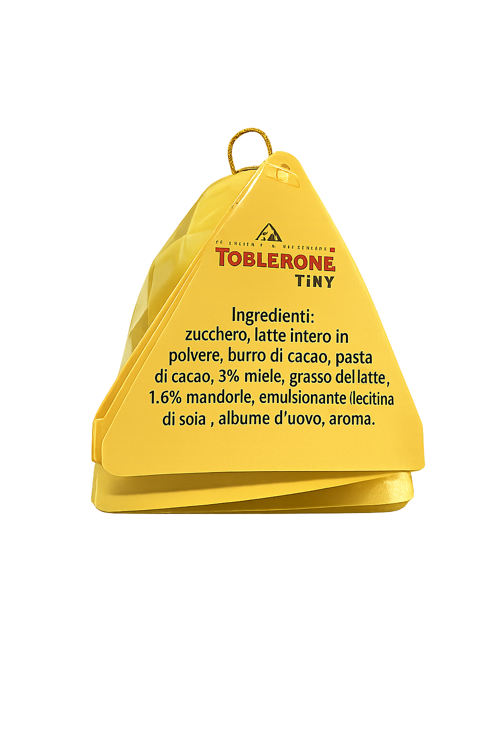 Ingredienti: zucchero, latte intero in polvere, burro di cacao, pasta di cacao, 3% miele, grasso del latte, 1,6% mandorle, emulsionante (lecitina di soia), albume d’uovo, aroma.