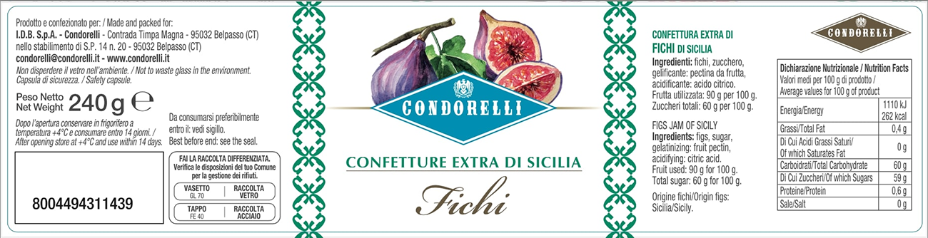 Ingredienti: fichi, zucchero, gelificante: pectina da frutta, acidificante: acido citrico. frutta utilizzata 90g per 100g – zucchero totali: 60g per 100g