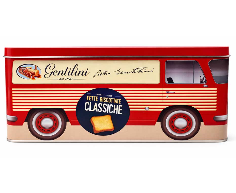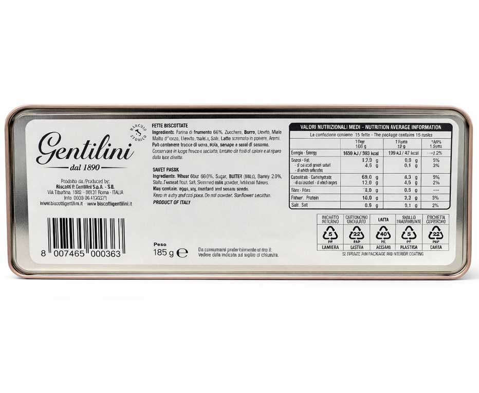 Questo speciale formato da 185 g combina la bontà delle fette biscottate classiche con l’estetica raffinata di una scatola in metallo dal look vintage. Perfette per conservare le fette una volta aperte, la latta preserva la fragranza e la croccantezza uniche del prodotto, rendendolo ideale anche come regalo o oggetto da collezione per gli amanti del design d’altri tempi.