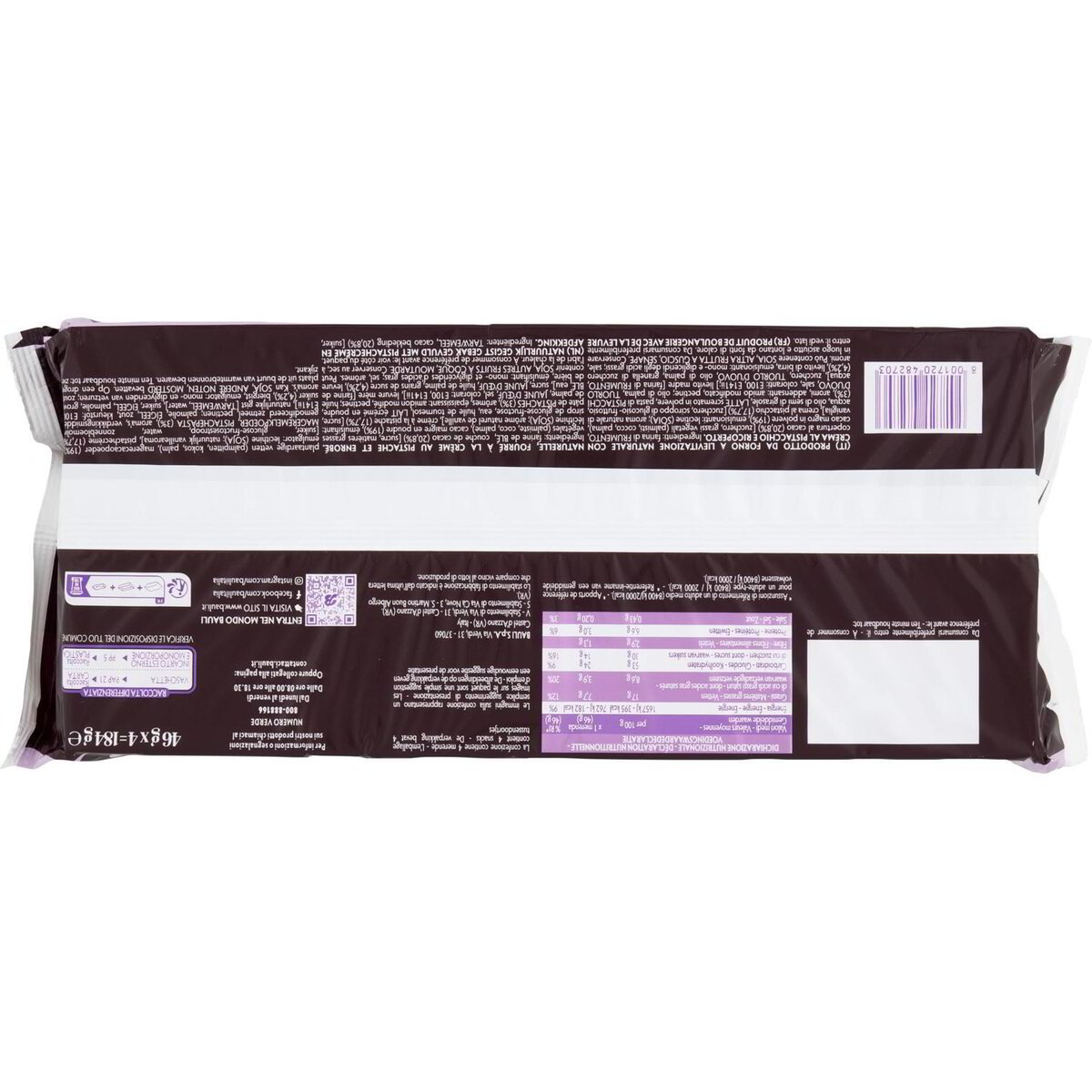 Ingredienti: Farina di frumento, Copertura al cacao (20,8%) [zucchero, grassi vegetali (palmisti, cocco, palma), cacao magro in polvere (19%), emulsionanti: lecitine (soia); aroma naturale di vaniglia], Crema al pistacchio (17,7%) [zucchero, sciroppo di glucosio- fruttosio, acqua, olio di semi di girasole, latte scremato in polvere, pasta di pistacchi (3%), aromi, addensanti: amido modificato, pectine; olio di palma, tuorlo d’uovo, sale, coloranti: E100, E141ii;]. Lievito madre [farina di frumento, acqua], Zucchero, Tuorlo d’uovo, Olio di palma, Granella di zucchero (4,2%), Lievito di birra, Emulsionanti: mono- e digliceridi degli acidi grassi, Sale, Aromi.