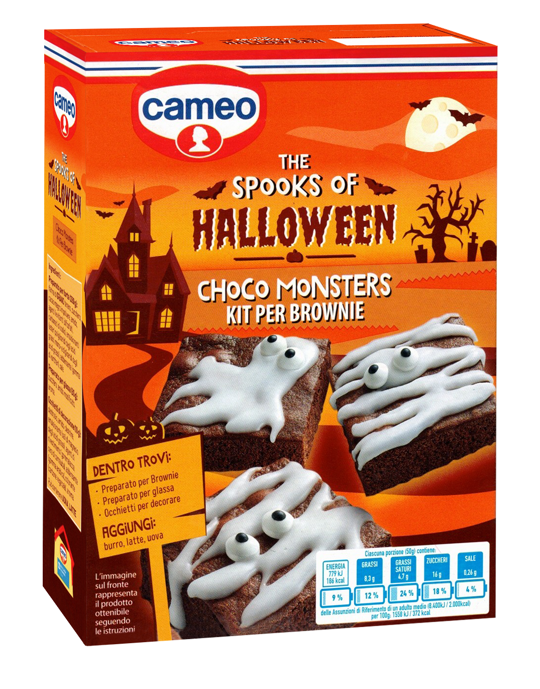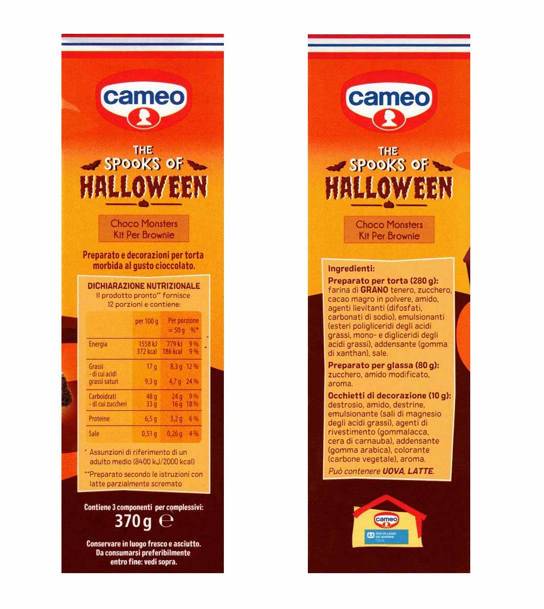 Trasforma i tuoi dolci in deliziose creazioni da brivido con il kit Cameo “The Spooks of Halloween” Choco Monsters! Questo kit completo da 370g contiene tutto il necessario per preparare 12 spaventosi brownie decorati: un preparato per brownie al cioccolato (280g), glassa bianca (80g) e divertenti occhietti decorativi (10g) per creare fantasmini. Il kit include istruzioni dettagliate per la preparazione: basta aggiungere burro, latte, uova e acqua al preparato per brownie, cuocere in forno e decorare con la glassa per creare simpatici fantasmi. Perfetto per feste di Halloween, merende a tema o per divertirsi in cucina con i bambini. La confezione contiene tutti gli ingredienti pre-dosati per garantire risultati perfetti. Conservare in luogo fresco e asciutto. Da consumarsi preferibilmente entro la data indicata sulla confezione. Ideale per chi cerca un’attività divertente e creativa da fare in famiglia durante la stagione di Halloween.