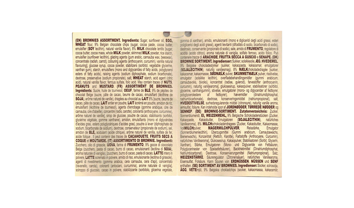 Chocolate Brownies: Zucchero, olio di girasole, uova, farina di frumento, gocce di cioccolato belga (zucchero, pasta di cacao, burro di cacao, lecitina di soia, aroma naturale di vaniglia), sciroppo di glucosio, cacao in polvere, stabilizzante (sorbitolo, glicerina vegetale, gomma di xantahn), mono e digliceridi degli acidi grassi, esteri poliglicerici degli acidi grassi, agenti lievitanti (difosfato di sodio, bicarbonato di sodio), destrosio, propinato di sodio come conservante, sale, amido di frumento, regolatore di acidità (acido citrico), aroma naturale di vaniglia, solfato ferroso, acido folico.