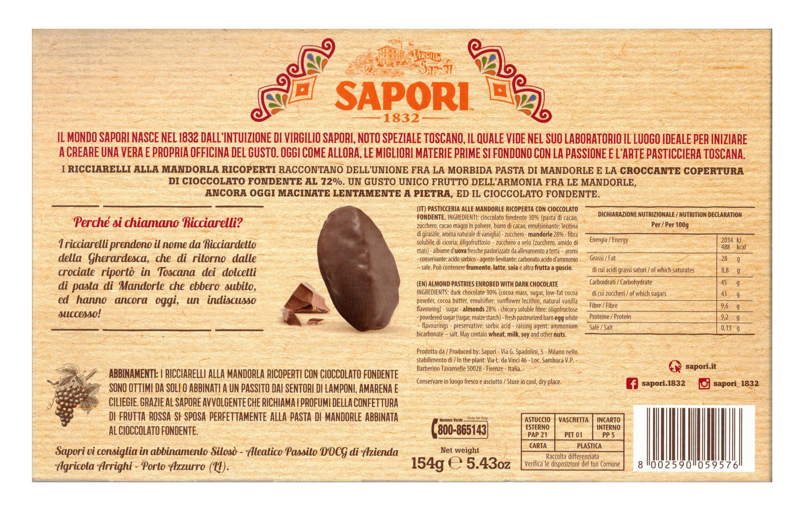 I Ricciarelli alla mandorla ricoperti raccontano dell’unione fra la morbida pasta di mandorle e la croccante copertura di cioccolato fondente al 72%. Un gusto unico frutto dell’armonia fra le mandorle, ancora oggi macinate lentamente a pietra, ed il cioccolato fondente. I ricciarelli prendono il nome da Ricciardello della Gherardesca, che di ritorno dalle crociate riportò in Toscana dei dolcetti di pasta di Mandorle che ebbero subito, ed hanno ancora oggi, un indiscusso successo. I Ricciarelli alla mandorla ricoperti con cioccolato fondente sono ottimi da soli o abbinati a un passito dai sentori di lamponi, lamponi, amarena e ciliegie. Grazie al sapore avvolgente che richiama i profumi della confettura di frutta rossa si sposa perfettamente alla pasta di mandorle abbinata al cioccolato fondente.