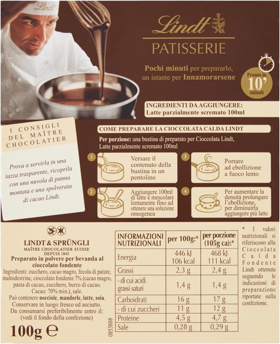 Scopri il piacere avvolgente della nostra cioccolata fondente calda, realizzata con il finissimo cioccolato fondente dei Maîtres Chocolatiers Lindt. Ogni confezione contiene 5 pratici pezzi, perfetti per preparare in pochi minuti una bevanda calda che scalda il cuore e delizia i sensi. Ideale per le giornate più uggiose o per concederti un momento di puro relax, questa cioccolata calda è un abbraccio di sapore e cremosità, capace di trasformare ogni sorso in un’esperienza indimenticabile. Non perdere l’occasione di coccolarti con un prodotto di alta qualità, perfetto da condividere con amici e familiari o da gustare in solitudine per un momento di dolcezza.