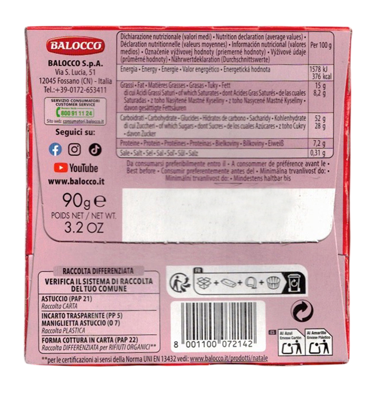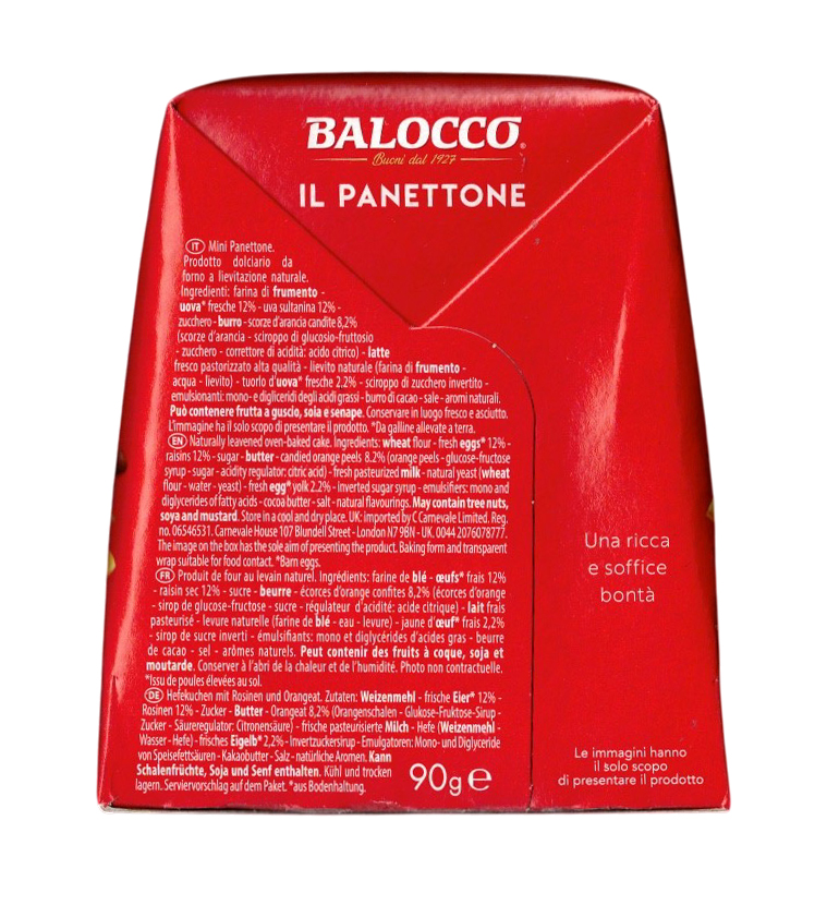 | Tipologia | Balocco Mini Panettone Uvetta e Canditi 90g, CAIYA Box con 6 Panettoncini |