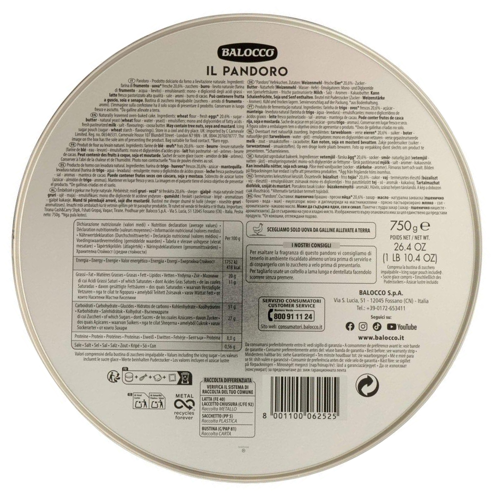 Farina di frumento – uova* fresche 20,6% – zucchero – burro – lievito naturale (farina di frumento – acqua – lievito) – emulsionanti: mono- e digliceridi degli acidi grassi – latte fresco pastorizzato alta qualità – sale – aromi – burro di cacao. Può contenere frutta a guscio, soia e senape. Bustina di zucchero impalpabile (zucchero – amido di frumento – aromi).