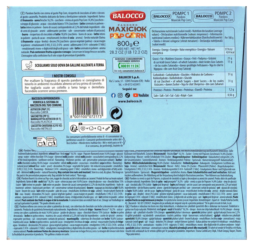 Farina di frumento – uova* fresche 16,3% – zucchero – crema al gusto Pop Corn 14,4% [zucchero – sciroppo di glucosio – acqua – cioccolato bianco 15% (zucchero – latte scremato in polvere – latte intero in polvere – burro di cacao) corrispondente al 2,2% del totale ingredienti – olio di semi di girasole – aromi – addensante: pectine – sale – conservante: sorbato di potassio] – burro – ricopertura di cioccolato al latte 10,6% (zucchero – burro di cacao – latte intero in polvere – pasta di cacao – emulsionanti: lecitine di soia – aroma) – lievito naturale (farina di frumento – acqua – lievito) – decoro 2% [zucchero – grasso vegetale (palma) – cacao magro in polvere – emulsionanti: E 492, E 322, E 476 – aromi – addensante: E 414 – colorante: E 160c] – emulsionanti: mono- e digliceridi degli acidi grassi – sale – latte scremato in polvere – aroma naturale. Può contenere frutta a guscio e senape.