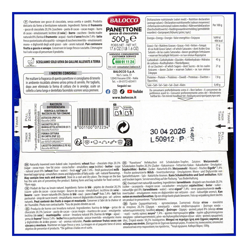 farina di frumento – gocce di cioccolato 20,3% [zucchero – pasta di cacao – cacao magro – burro di cacao – emulsionanti: lecitine (di soia)] – burro – zucchero – lievito madre naturale 8% (farina di frumento – acqua) – tuorlo d’uova* fresche 7,4% – latte fresco pastorizzato alta qualità – sciroppo di zucchero invertito – emulsionanti: mono- e digliceridi degli acidi grassi – sale – aromi naturali. Può contenere frutta a guscio e senape.