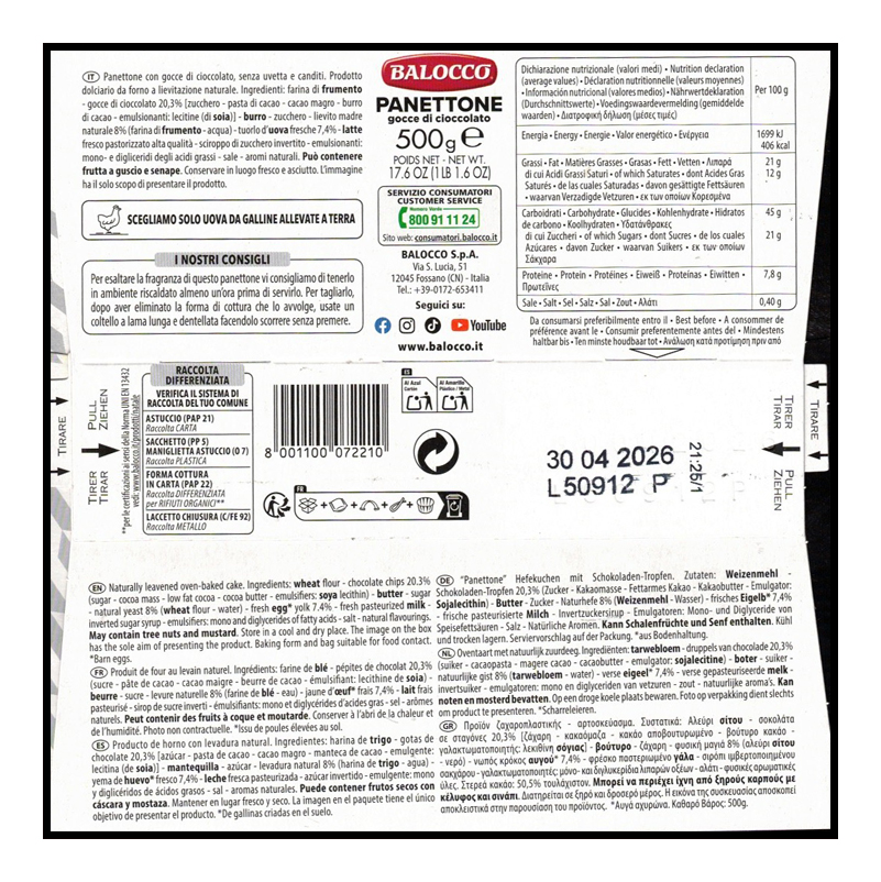 farina di frumento – gocce di cioccolato 20,3% [zucchero – pasta di cacao – cacao magro – burro di cacao – emulsionanti: lecitine (di soia)] – burro – zucchero – lievito madre naturale 8% (farina di frumento – acqua) – tuorlo d’uova* fresche 7,4% – latte fresco pastorizzato alta qualità – sciroppo di zucchero invertito – emulsionanti: mono- e digliceridi degli acidi grassi – sale – aromi naturali. Può contenere frutta a guscio e senape.