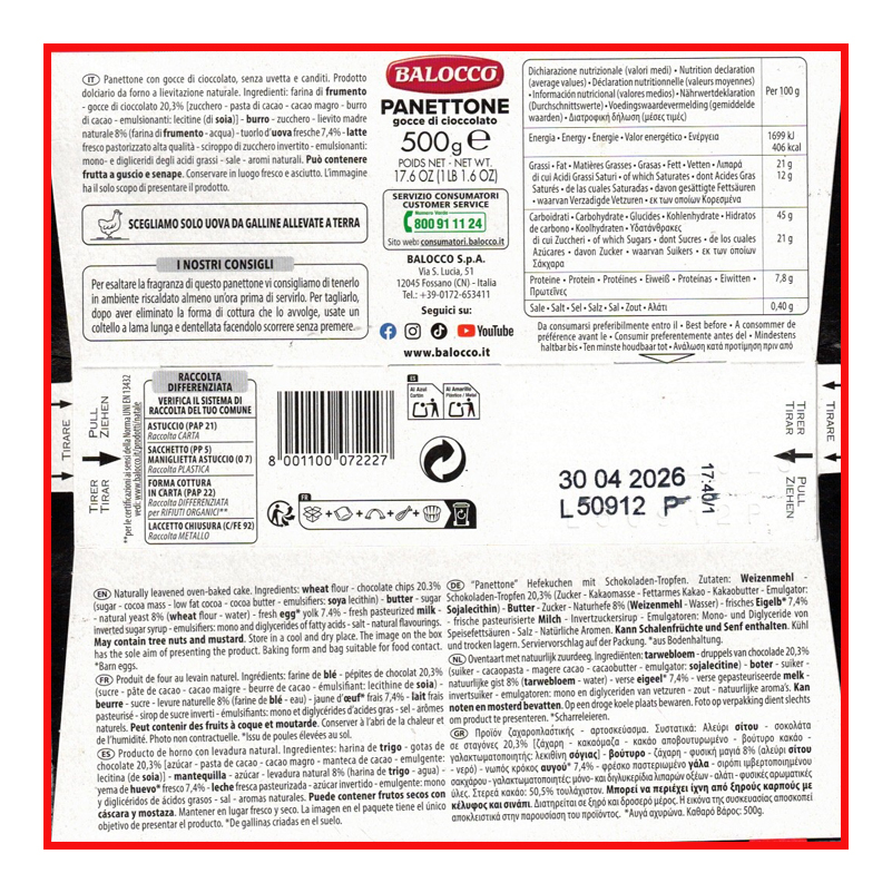 farina di frumento – gocce di cioccolato 20,3% [zucchero – pasta di cacao – cacao magro – burro di cacao – emulsionanti: lecitine (di soia)] – burro – zucchero – lievito madre naturale 8% (farina di frumento – acqua) – tuorlo d’uova* fresche 7,4% – latte fresco pastorizzato alta qualità – sciroppo di zucchero invertito – emulsionanti: mono- e digliceridi degli acidi grassi – sale – aromi naturali. Può contenere frutta a guscio e senape.