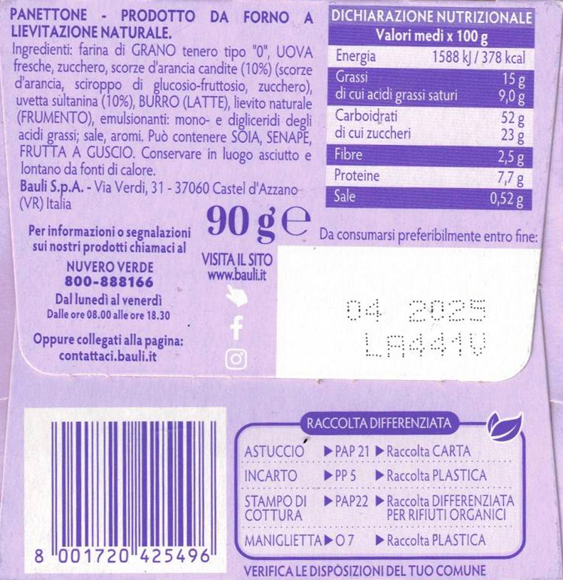Ingredienti: Farina di grano tenero tipo “0”, Uova fresche, Zucchero, Scorze d’arancia candite (10%) (scorze d’arancia, sciroppo di glucosio-fruttosio, zucchero), Uvetta sultanina (10%), Burro (latte), Lievito naturale (frumento), Emulsionanti: mono- e digliceridi degli acidi grassi, Sale, Aromi, Può contenere soia, senape, frutta a guscio.
