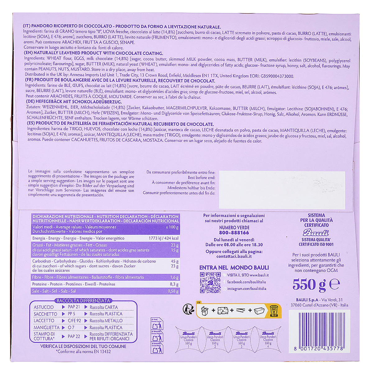 farina di GRANO tenero tipo “0”, UOVA fresche, cioccolato al latte (14,7%) [zucchero, burro di cacao, LATTE scremato in polvere, pasta di cacao, BURRO (LATTE), emulsionanti: lecitine (SOIA), E 476; aromi], zucchero, BURRO (LATTE), lievito naturale (FRUMENTO), emulsionanti: mono- e digliceridi degli acidi grassi; sciroppo di glucosio- fruttosio, alcool, miele, sale, aromi.