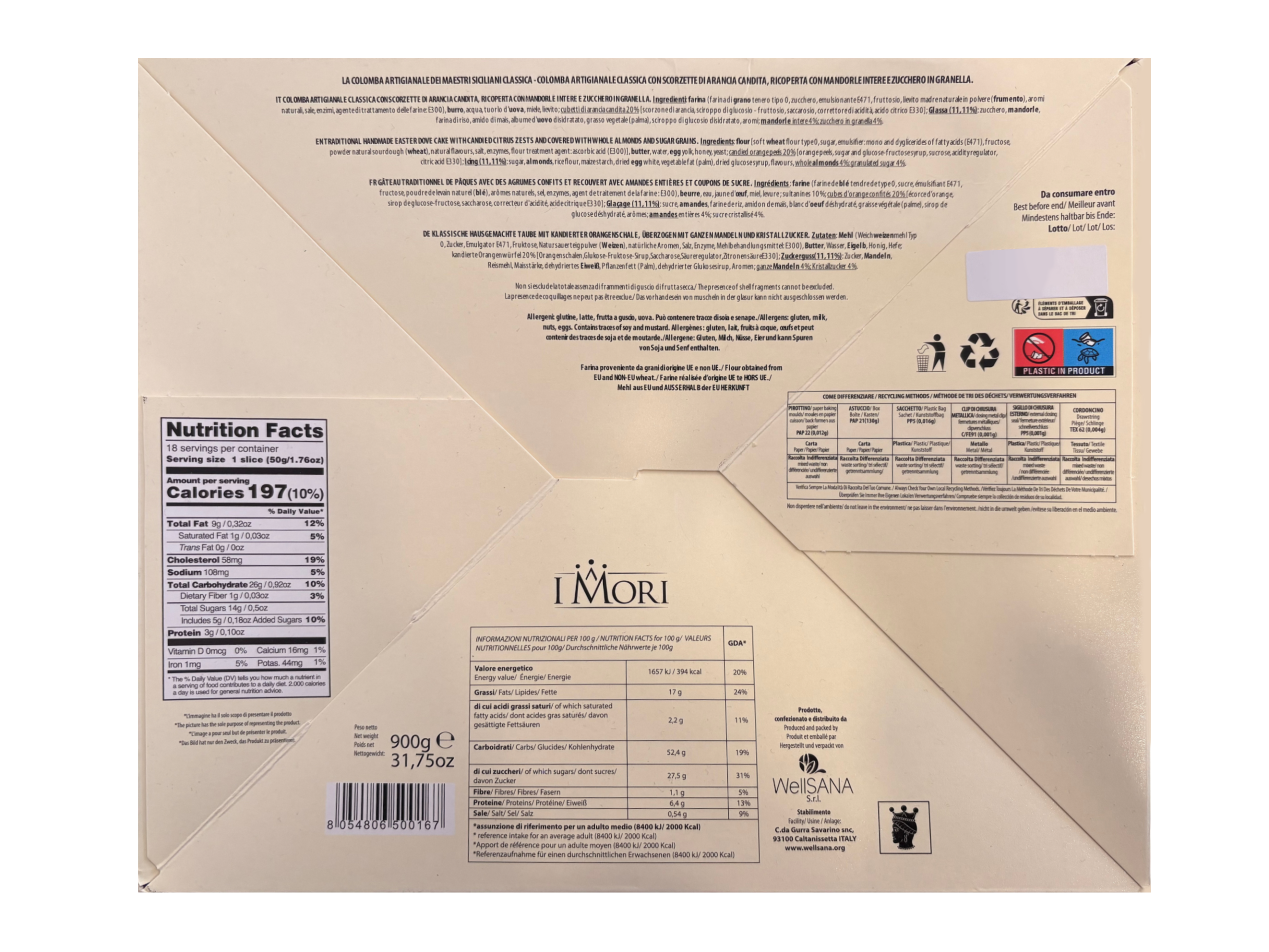 Ingredienti: Farina di grano tenero tipo 0, zucchero, burro, uova, tuorlo d’uovo, acqua, lievito madre naturale in polvere (frumento), fruttosio, emulsionante E471, aromi naturali, sale, enzimi, agente di trattamento della farina (acido ascorbico E300), scorze di arancia candita, miele.